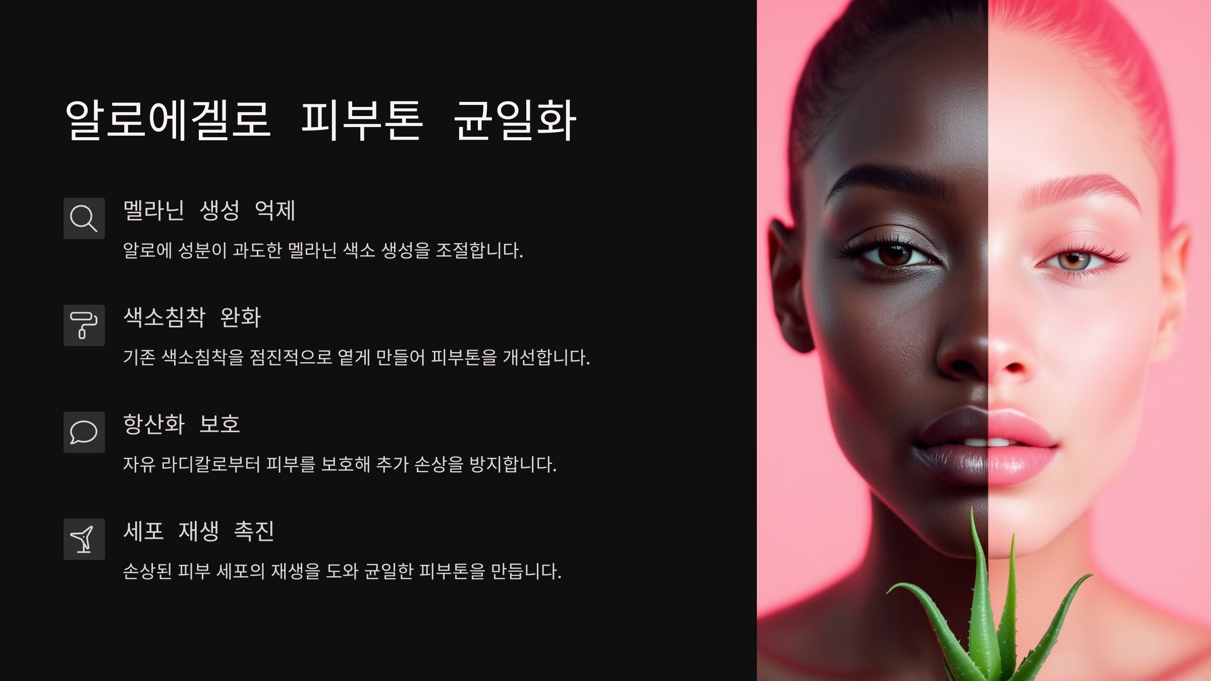 알로에겔에는 멜라닌 생성을 억제하는 성분도 포함돼 있어요. 그래서 색소침착을 예방하거나 완화하는 데 효과가 있답니다. 매일 바르다 보면 서서히 피부톤이 균형을 되찾게 되는 걸 느낄 수 있어요.