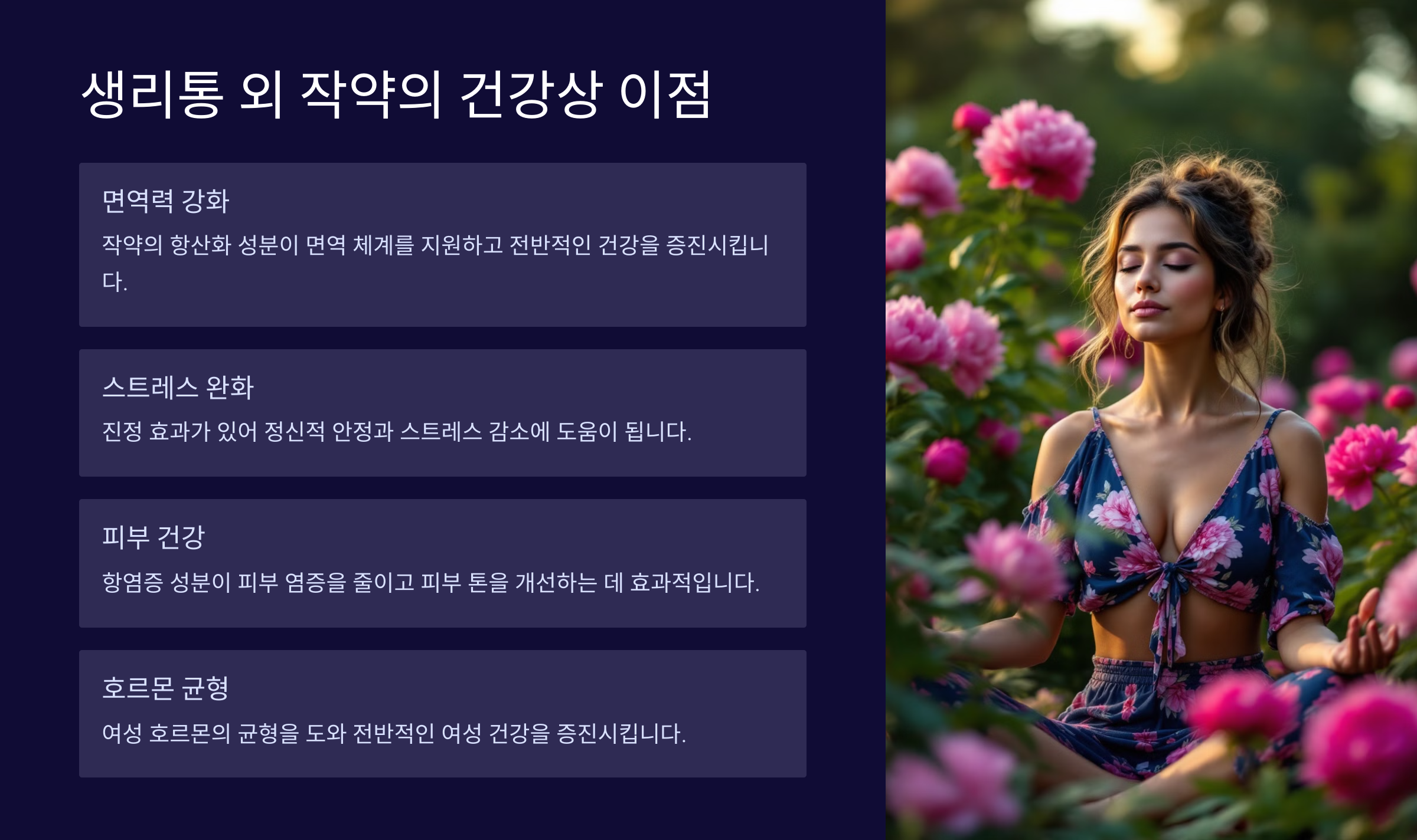 게다가 작약은 중추신경계를 안정시키는 효과도 있어서, 단순히 통증만 완화하는 게 아니라 마음까지 편안하게 해줘요. 불안하거나 예민해지는 생리 주간에 복용하면 심리적으로도 안정이 돼요. 이것이 작약이 여성들에게 사랑받는 진짜 이유 같아요!