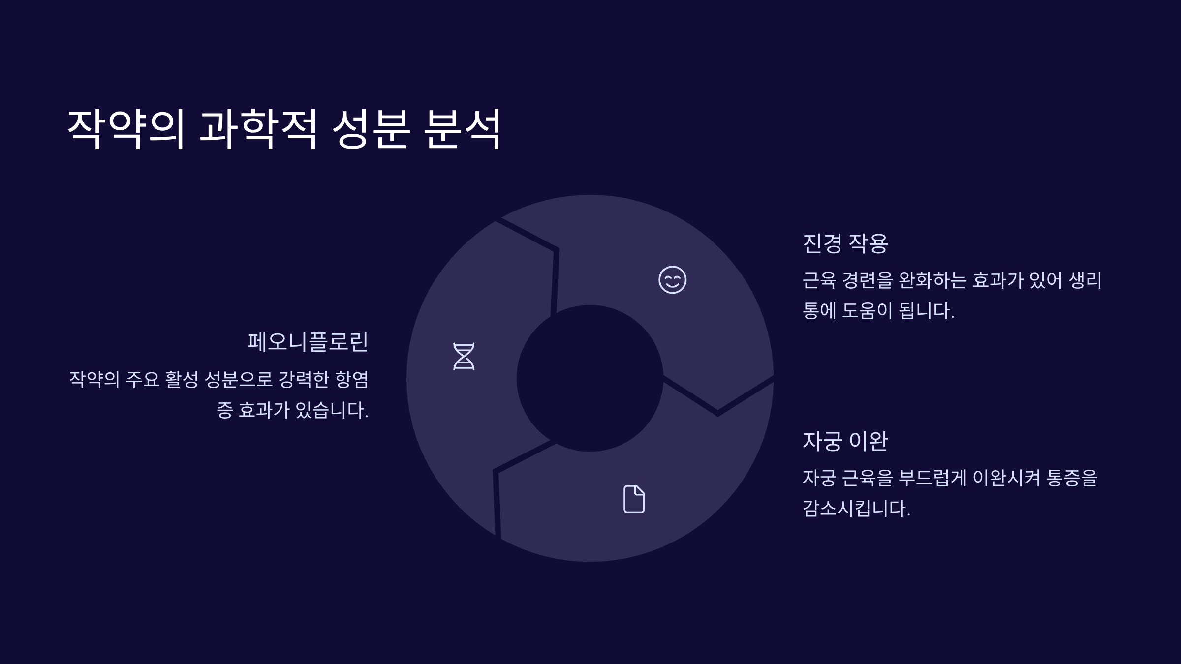 작약의 뿌리에는 ‘페오니플로린(Paeoniflorin)’이라는 강력한 생리활성 성분이 들어 있어요. 이 성분은 자궁 근육을 부드럽게 이완시켜서 과도한 수축으로 인한 통증을 완화해 주는 효과가 있어요. 생리통의 주요 원인 중 하나가 바로 자궁 근육의 경련이기 때문에, 작약은 그 뿌리부터 핵심을 겨냥하는 셈이에요.