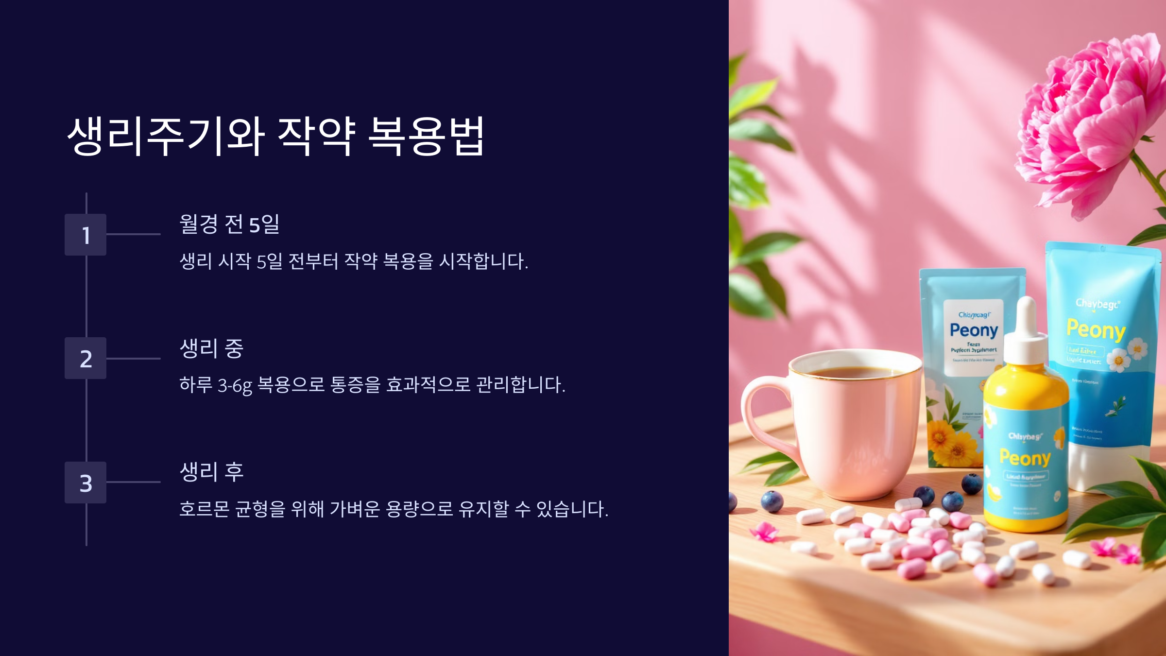 작약은 생리 주기의 어느 시점에 복용하느냐에 따라 효과가 달라질 수 있어요. 일반적으로는 생리 3~5일 전부터 복용을 시작하는 게 가장 이상적이에요. 자궁 근육이 수축하기 시작하는 시기를 선제적으로 대비하는 거죠.