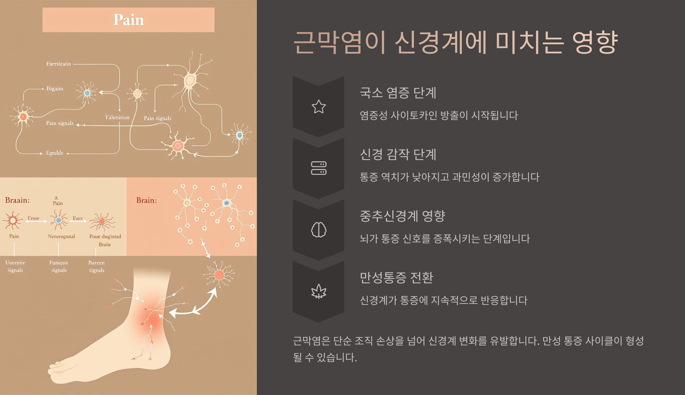 족저근막이 염증으로 인해 두꺼워지면, 발바닥을 지나가는 신경 다발이 눌리게 되고 이 신호는 뇌에 과민 반응을 일으키게 돼요. 이건 단순한 ‘통증’이 아니라, 신경과 근막 사이의 비정상적인 피드백 루프가 형성된 상태예요.