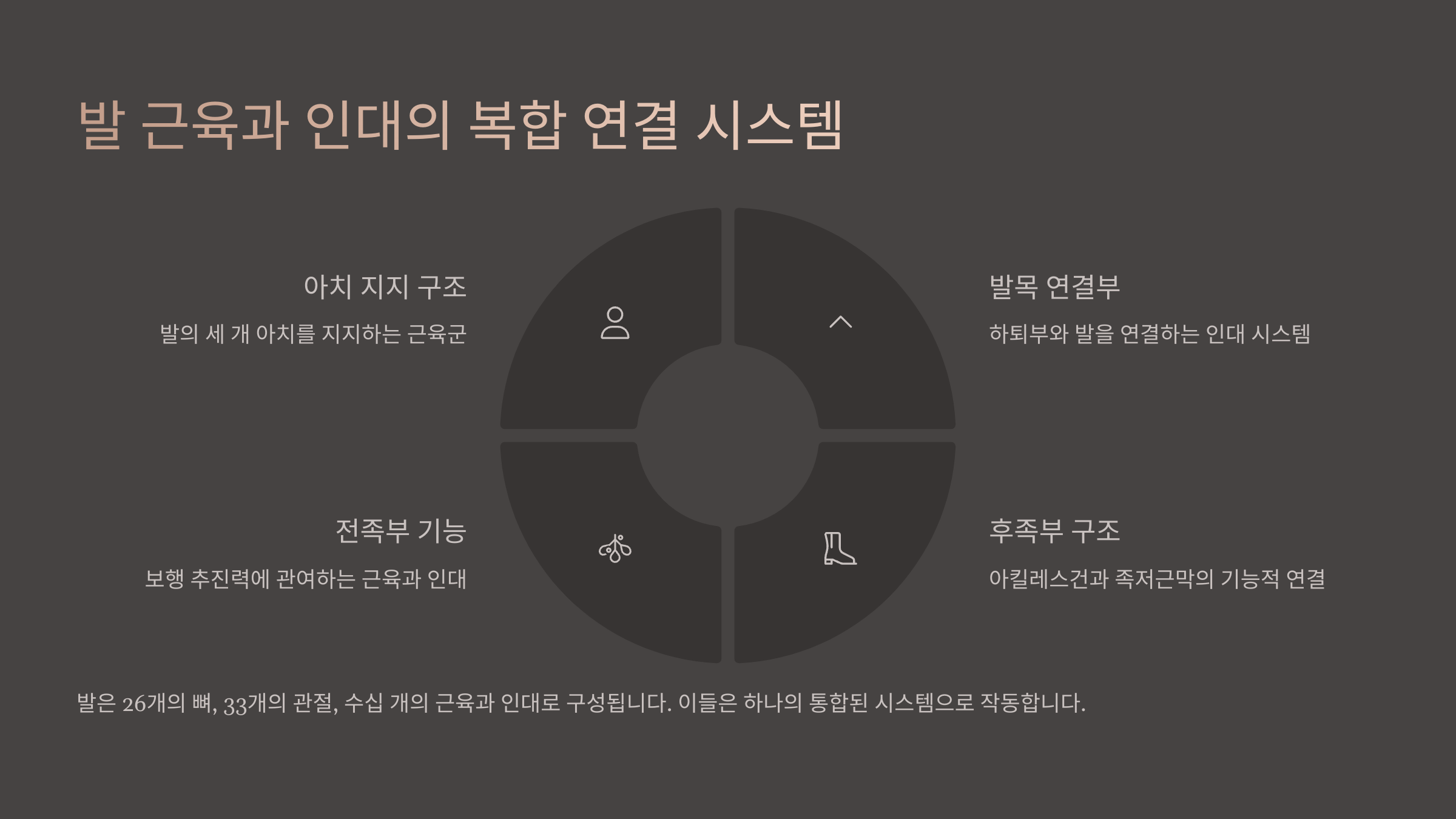 우리의 발은 단순히 걸음만을 위한 구조물이 아니에요. 무려 26개의 뼈, 33개의 관절, 그리고 100개가 넘는 인대와 근육들이 서로 조화롭게 작동하면서 움직임을 만들어내죠. 이 복잡한 구조 덕분에 걷기, 달리기, 점프 같은 다양한 동작이 가능해요.
