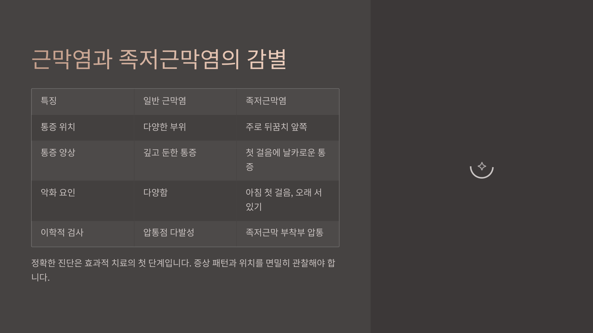 반면 '족저근막염'은 발바닥에 위치한 족저근막에 국한된 염증이에요. 주로 발뒤꿈치와 앞쪽 발바닥의 연결 부위에서 통증이 발생하며, 아침 첫걸음 때 통증이 심한 것이 전형적인 특징이에요.