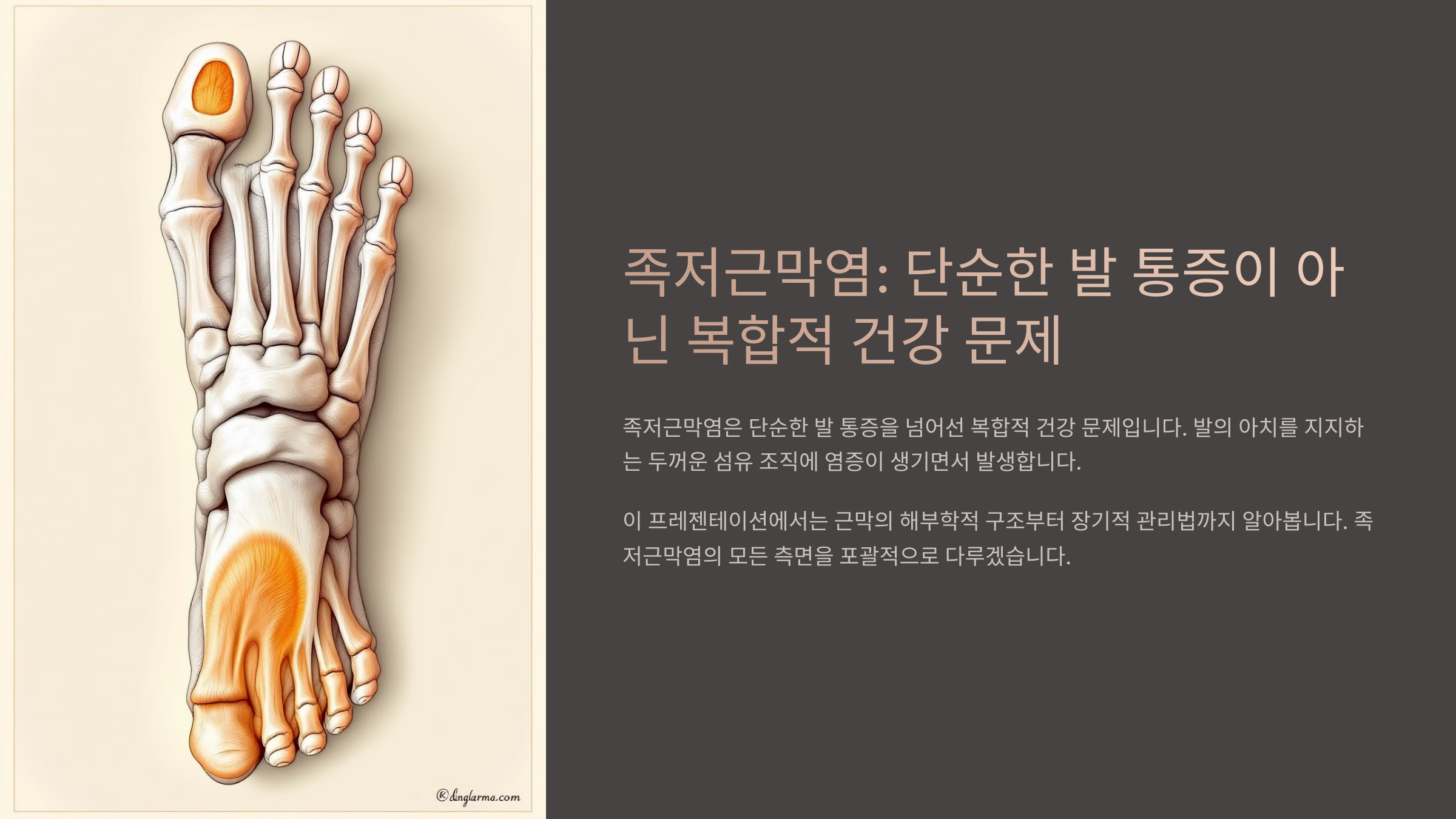 내가 생각했을 때, 근막은 마치 거미줄처럼 정교하게 신체를 감싸며, 어딘가 한 곳이 뻣뻣해지면 전체 균형이 무너질 수 있어요. 족저근막염도 결국 발만의 문제가 아니라, 이 정교한 거미줄 네트워크 전체의 반응일 수 있는 거죠.