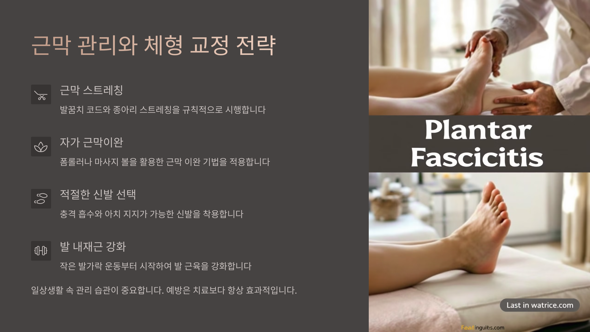 그리고 두 질환 모두 예방이 가장 중요한데요, 평소 체형 유지, 유연성 확보, 과사용 방지 등의 생활습관이 매우 중요해요. 특히 발과 다리의 컨디션은 전신 건강에 직결된다는 사실, 꼭 기억해야 해요!