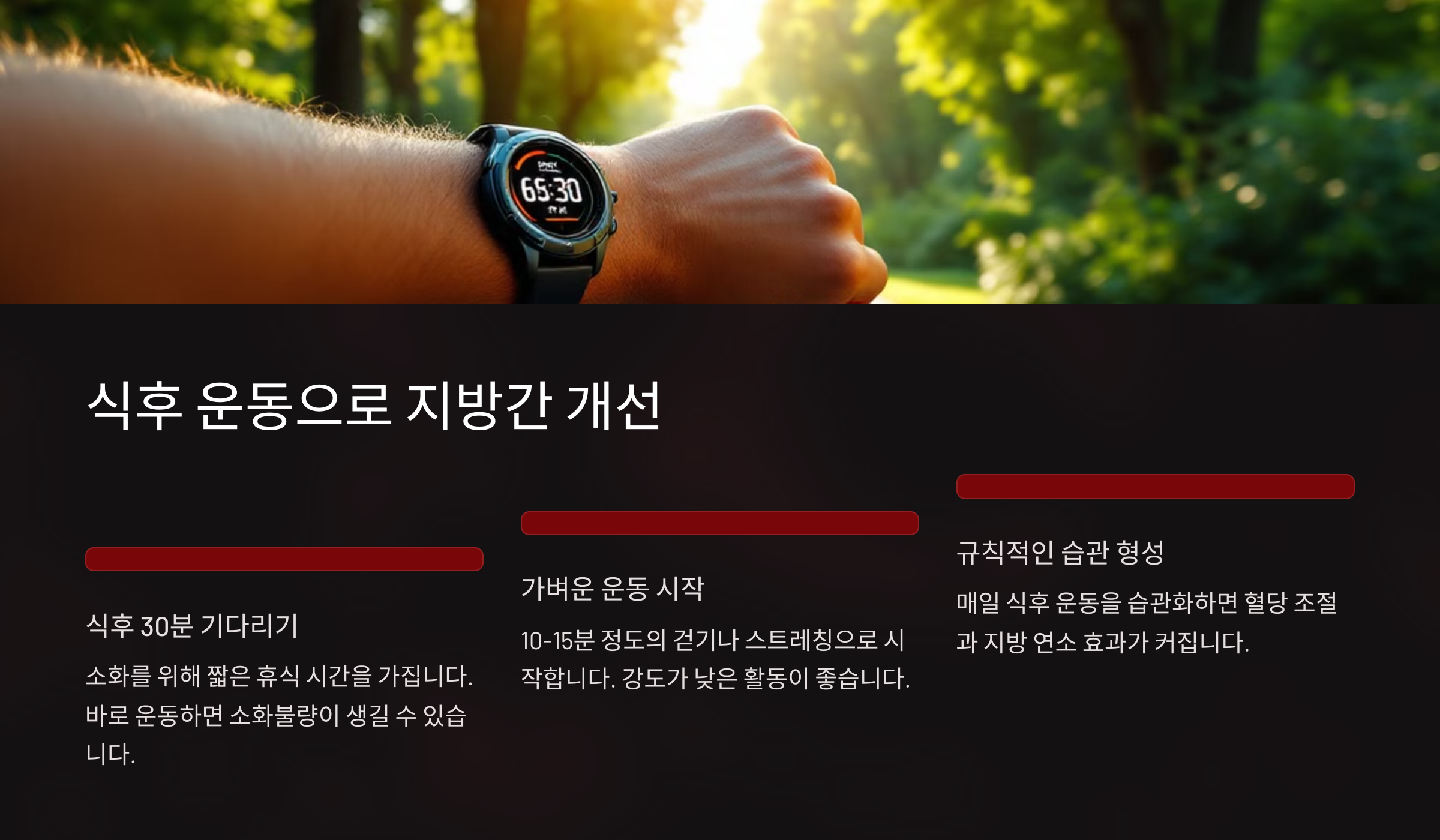 특히 식후 혈당이 급격히 상승할 때 가벼운 활동을 하면 혈당을 안정시키고, 그 여분의 당이 간에 지방으로 저장되는 걸 막을 수 있어요. 이 시점이 바로 식후 15분~45분 사이예요. 운동 타이밍이 정말 중요하죠! ⏱️