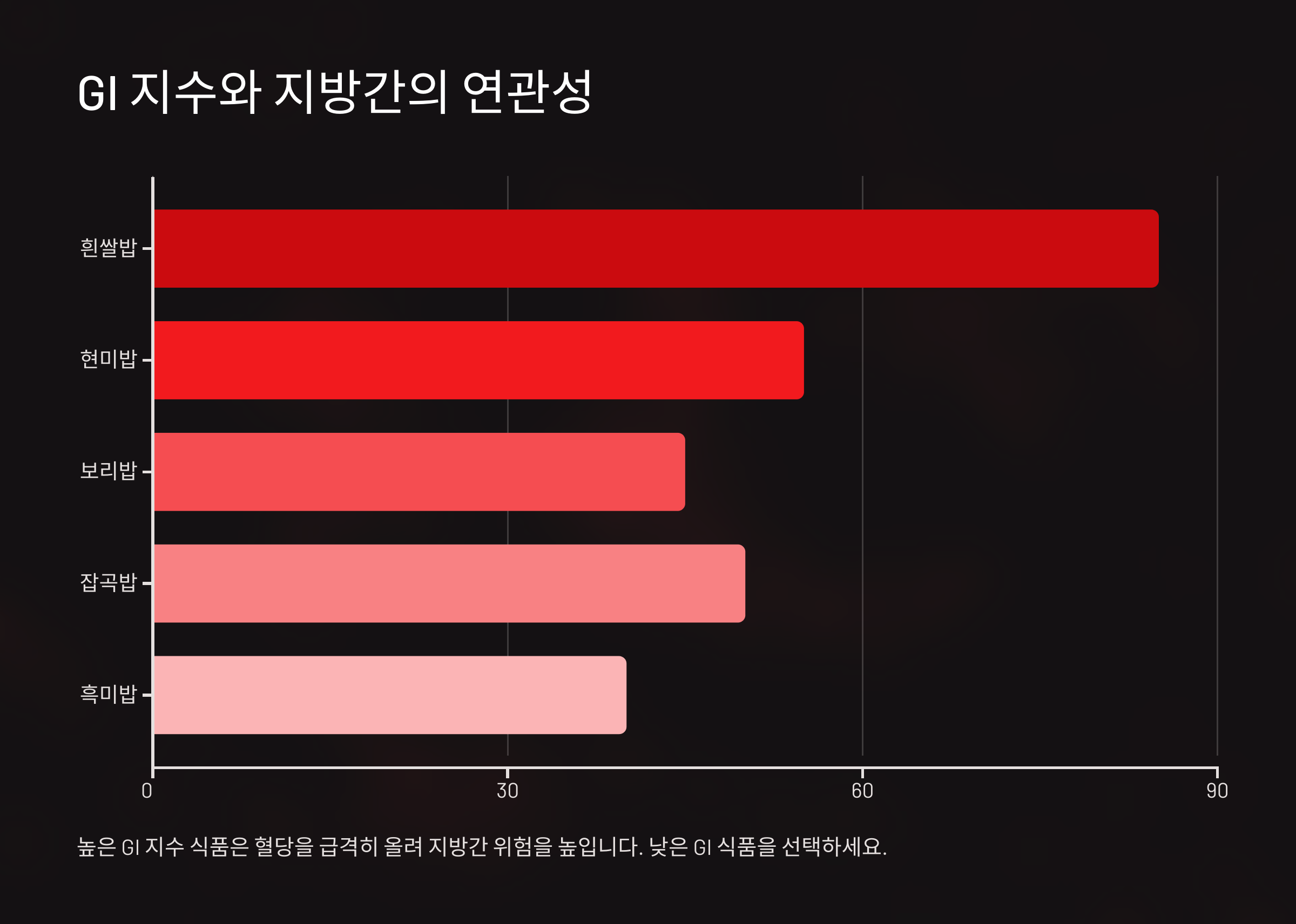 GI지수는 Glycemic Index의 줄임말로, 음식이 혈당을 얼마나 빨리 올리는지를 나타내는 지표예요. 이 수치가 높을수록 혈당이 빠르게 올라가고, 인슐린이 급격히 분비되기 때문에 간에 지방이 더 많이 쌓일 수 있어요. 결국 지방간과 GI지수는 아주 밀접한 관계를 가지고 있어요.