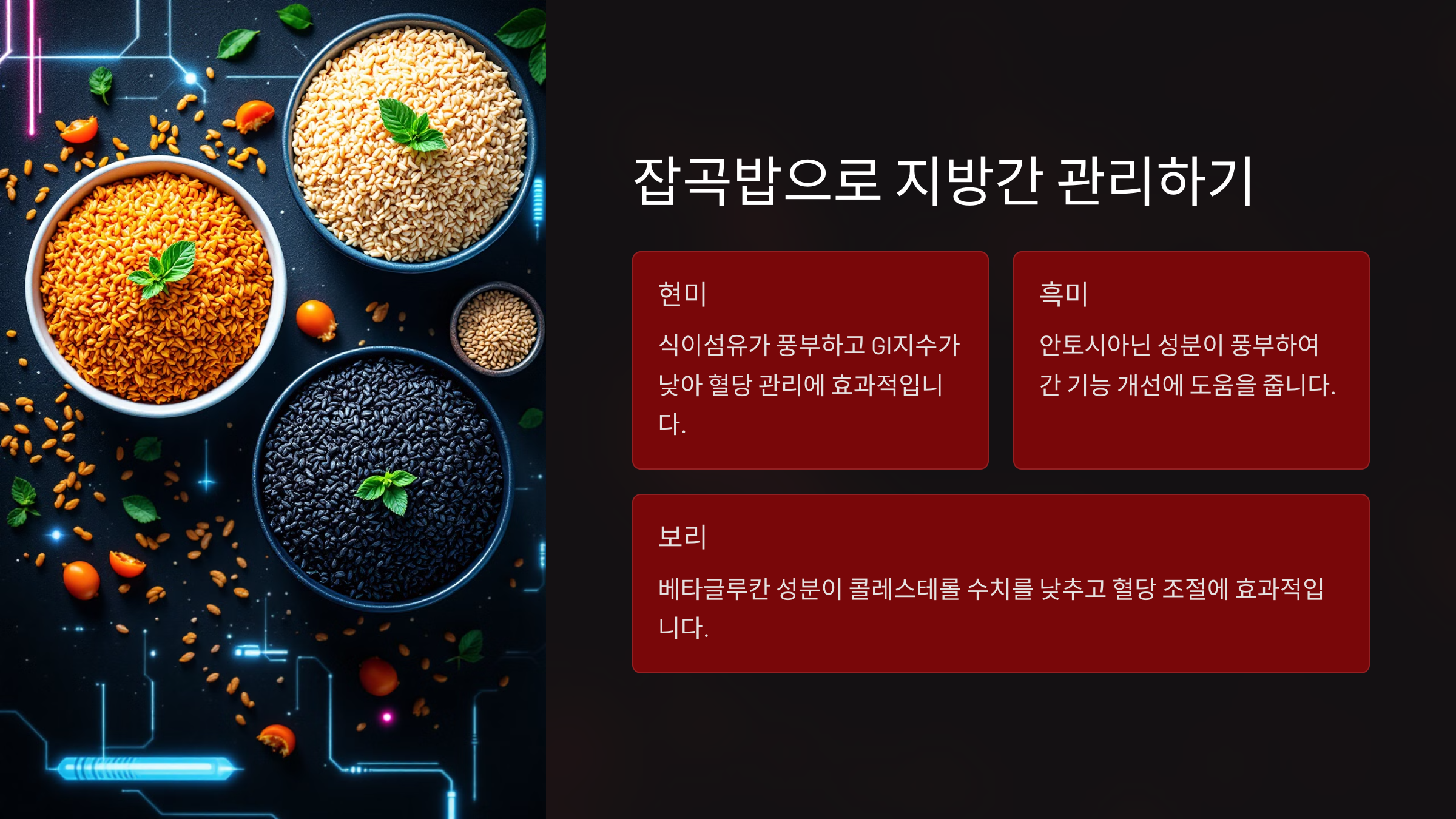 잡곡밥은 단순한 밥 그 이상이에요. 제대로 활용하면 건강한 간을 만드는 최고의 무기가 될 수 있어요. 지방간이 걱정될 때는 단백질, 섬유질, 지방의 균형이 잘 맞는 식단으로 구성하는 게 중요한데요, 잡곡밥은 그 출발점이에요!