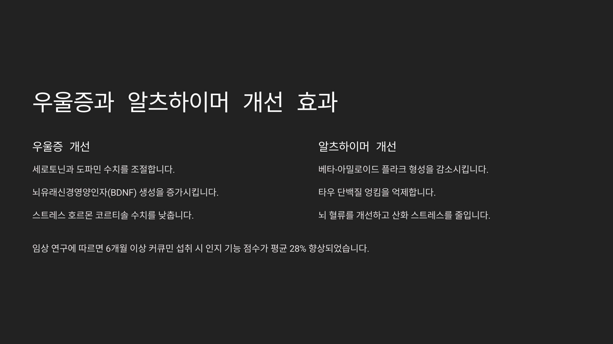 이제 다음 섹션에서는 커큐민이 정신 건강에도 어떤 영향을 주는지 살펴볼게요. 우울증과 치매에 관심 있다면 더 집중해도 좋아요! 😉