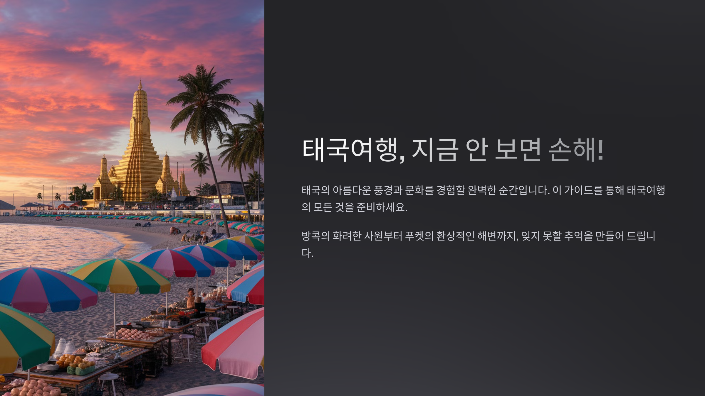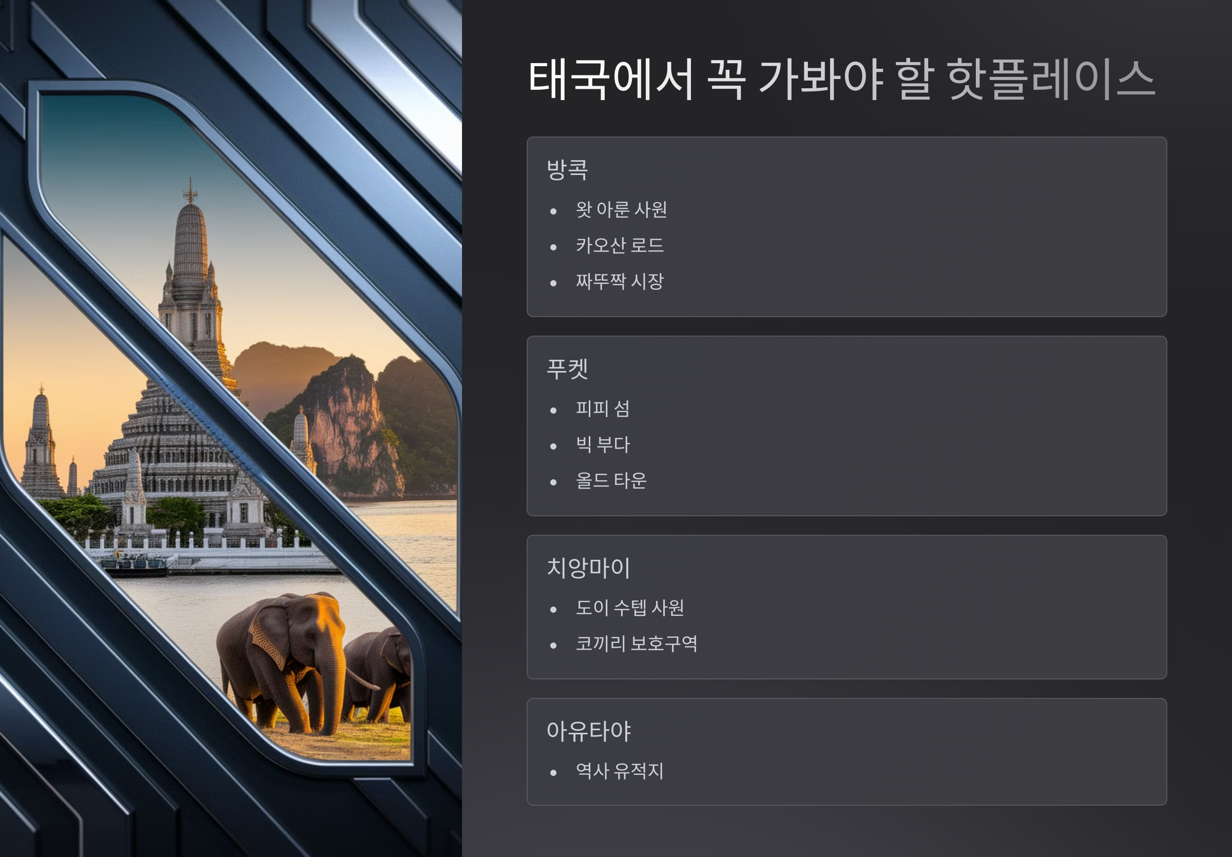 태국은 다양한 볼거리와 즐길 거리가 넘치는 나라예요. 🏝️ **방콕, 푸켓, 치앙마이, 파타야** 등 도시마다 색다른 매력이 있어서 여행 스타일에 맞게 선택할 수 있어요.