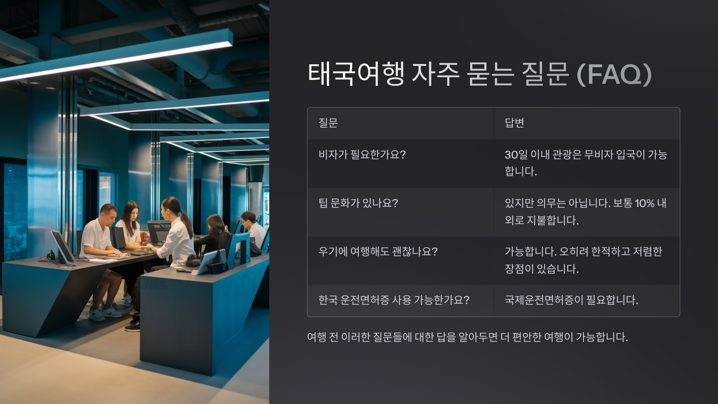 이제 태국 여행에 대한 거의 모든 정보를 알았어요! 🎉 마지막으로 **자주 묻는 질문(FAQ)**을 확인해볼까요? 🤔