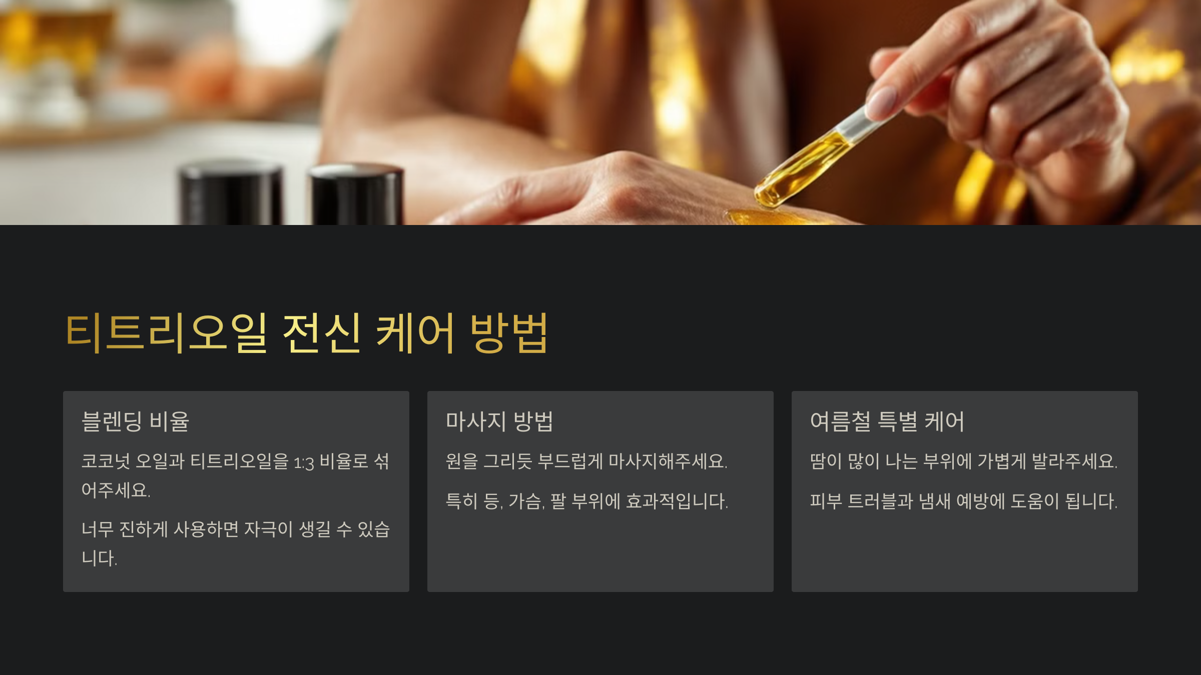 가장 기본은 바디 오일로 사용하는 방법이에요. 샤워 후 물기가 마르기 전, 호호바 오일 50ml에 티트리오일 20방울 정도 섞어 전신에 발라주세요. 보습과 동시에 향균 효과까지 챙길 수 있어서 여름철 특히 좋아요!
