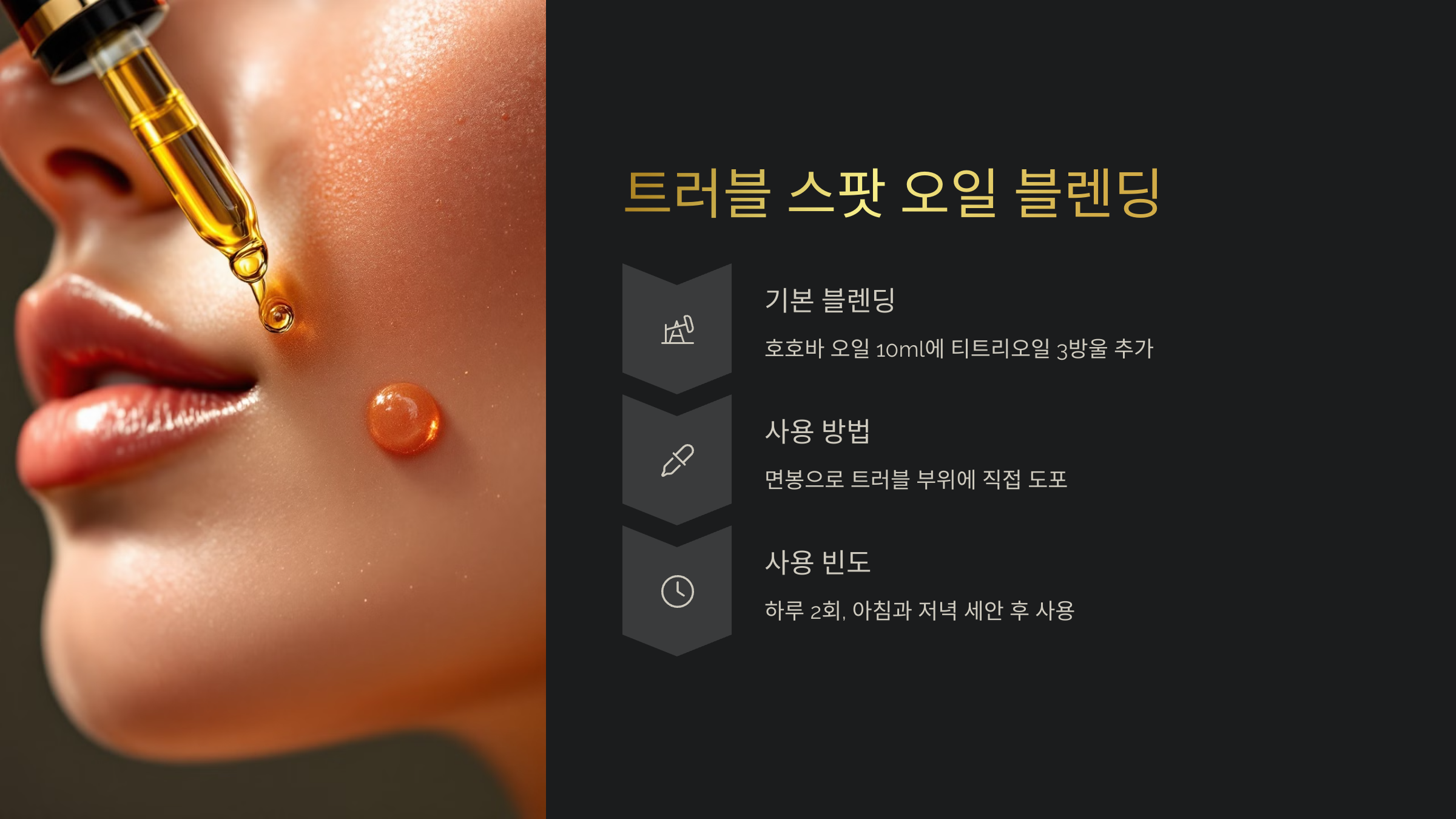 스팟 오일은 기본적으로 티트리오일을 1~2% 정도로 아주 낮은 농도로 희석해 사용하는 게 중요해요. 캐리어 오일로는 호호바 오일이나 포도씨 오일이 적합해요. 10ml 기준으로 호호바 오일 9.8ml에 티트리오일 2방울이면 딱 좋아요.