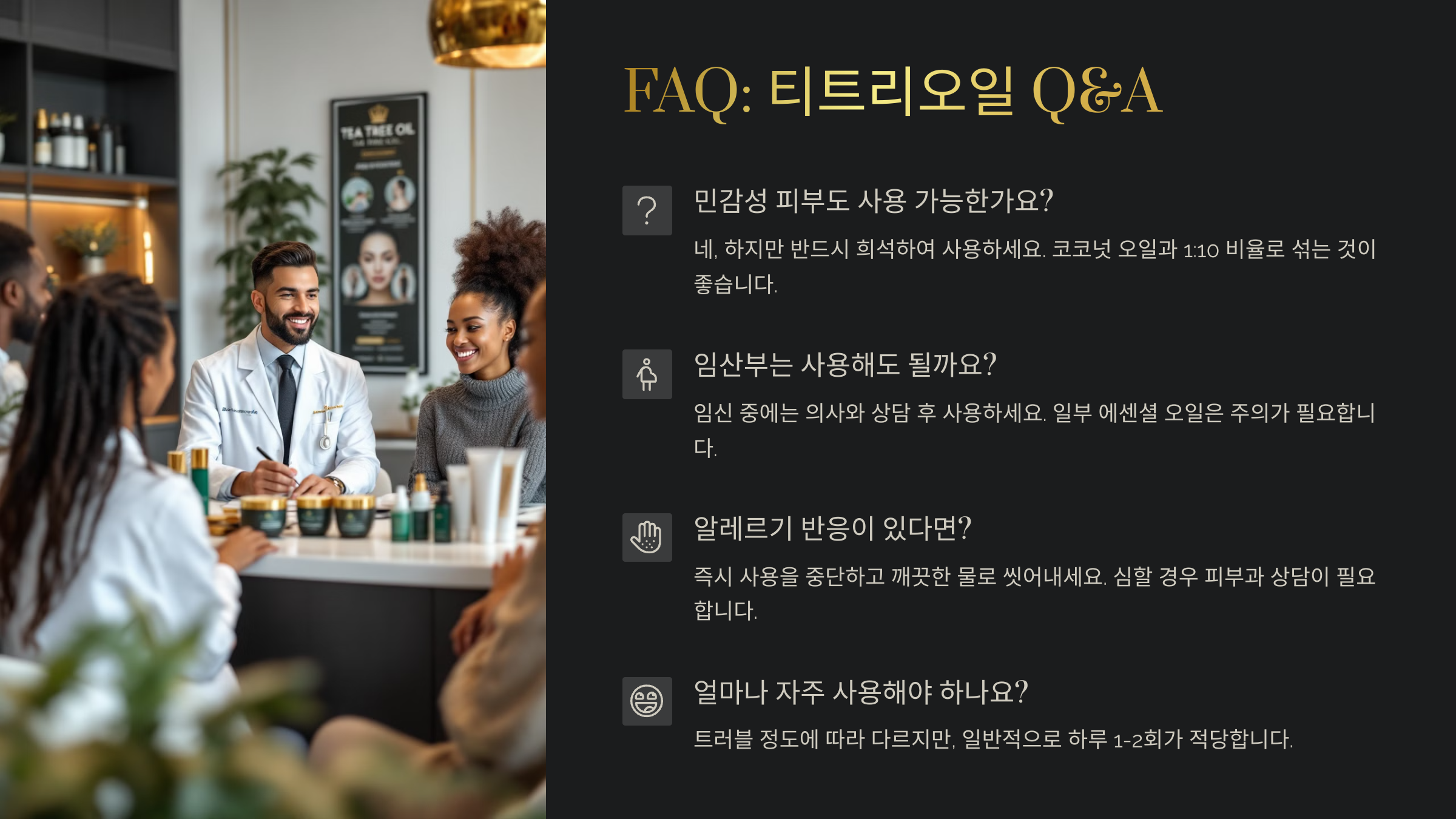A1. 아니요! 티트리오일은 피부에 강한 자극을 줄 수 있어서 반드시 캐리어 오일이나 다른 베이스와 함께 희석해서 사용해야 해요.