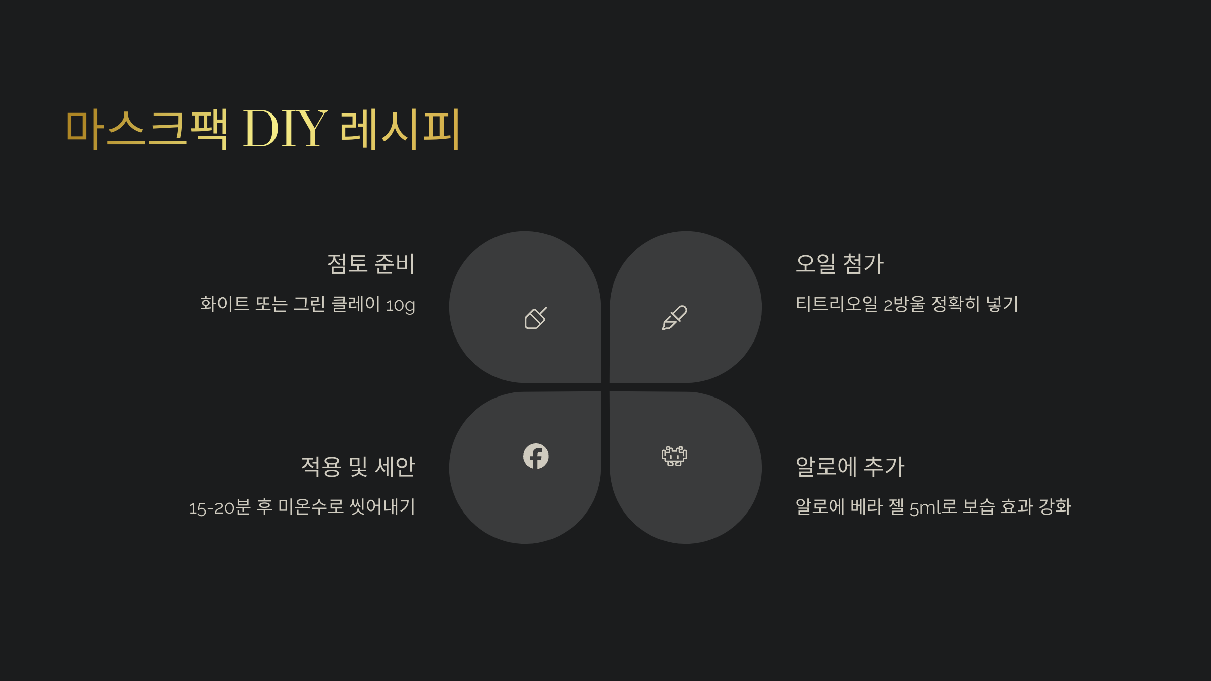 티트리오일로 만드는 마스크팩은 여드름이나 피지로 고민하는 사람들에게 특히 인기 많아요. 피부 자극 없이 수분을 공급하면서 동시에 트러블을 진정시켜주는 조합이죠. 가장 간단한 레시피는 티트리오일과 알로에젤, 녹차 파우더를 활용한 것이에요.