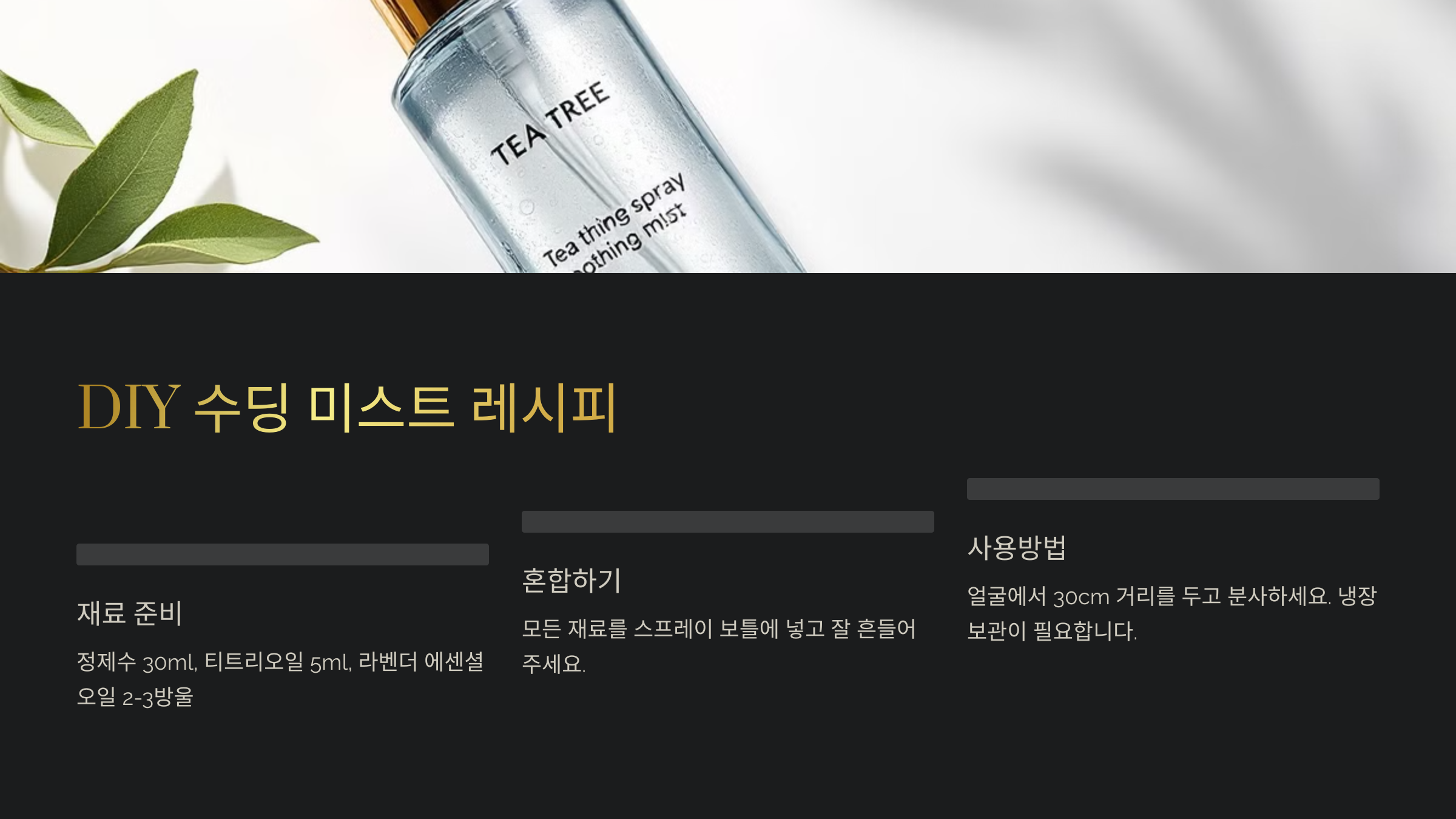 피부가 민감하거나 외부 자극으로 쉽게 붉어질 때, 수딩 미스트는 정말 효과적인 진정템이에요. 특히 티트리오일을 넣으면 뿌릴 때마다 자연스럽게 피부를 정돈해주고 트러블도 예방해주는 역할을 해요.