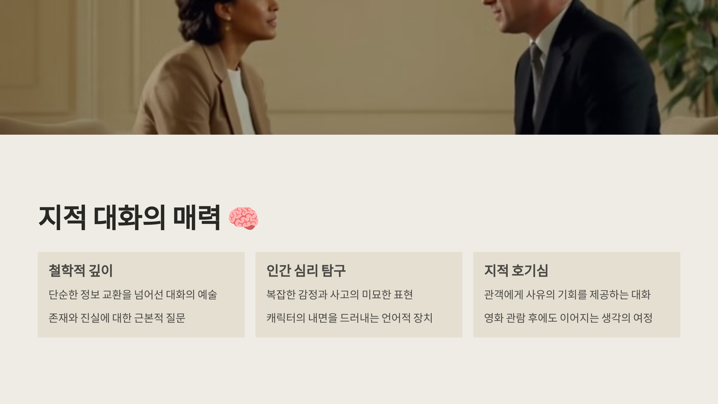 말이 많다고 지루한 게 아니에요. 대사 하나하나에 철학이 녹아 있고, 심리전이 오가는 작품들은 그 자체로 몰입감이 대단하죠.