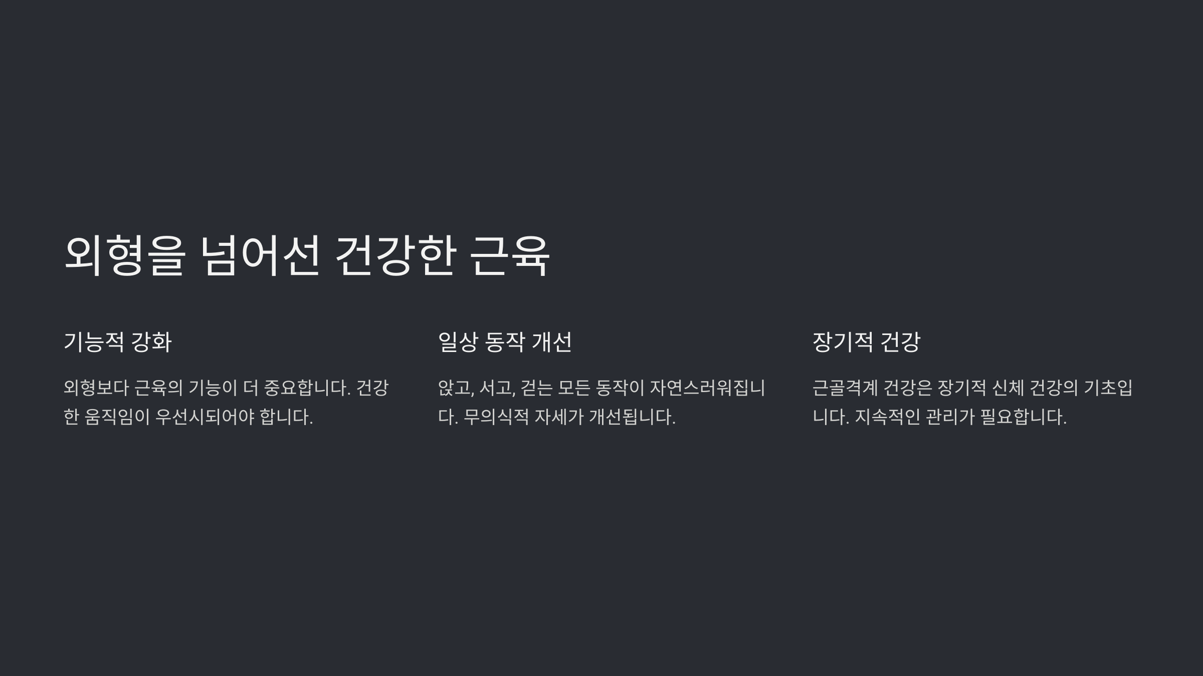 | 등 | 척추기립근 | 척추 지지 및 자세 유지 |