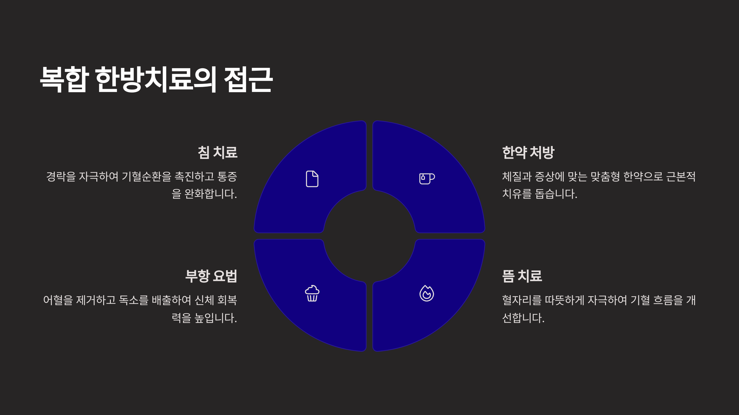 내가 생각했을 때, 한방치료는 단순히 통증을 줄이는 데서 그치는 게 아니라, 몸의 균형을 회복하고 스스로 치유할 수 있게 돕는 접근이기 때문에 더 깊은 치료를 원하는 분들께 좋은 선택지가 될 수 있어요.