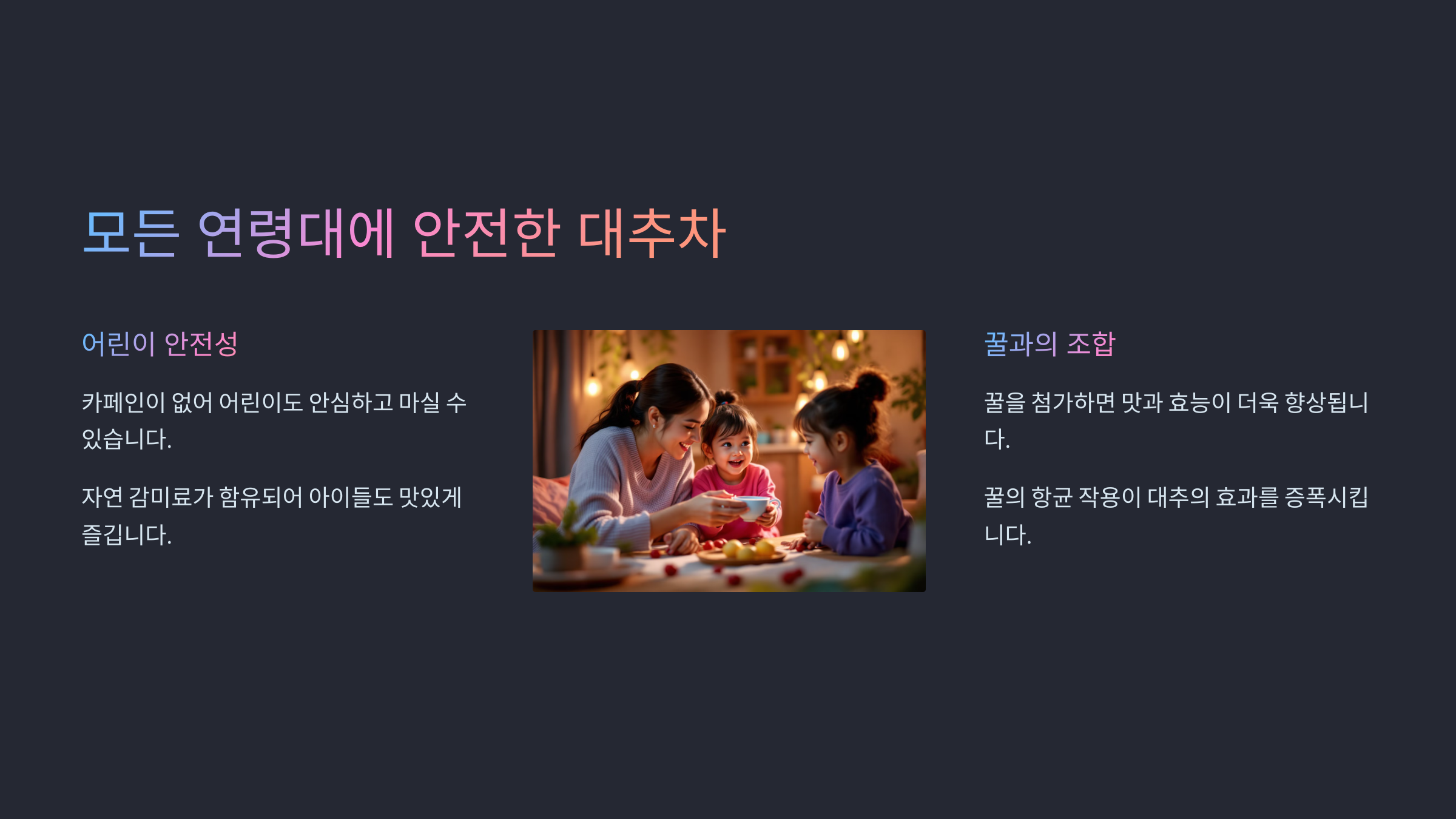 많은 부모님들이 ‘대추차는 아이들이 마셔도 괜찮을까?’라는 질문을 자주 해요. 결론부터 말하면, 대추차는 대부분의 아이들이 마셔도 안전한 음료예요. 오히려 아이들의 면역력 향상에 도움을 줄 수 있죠.