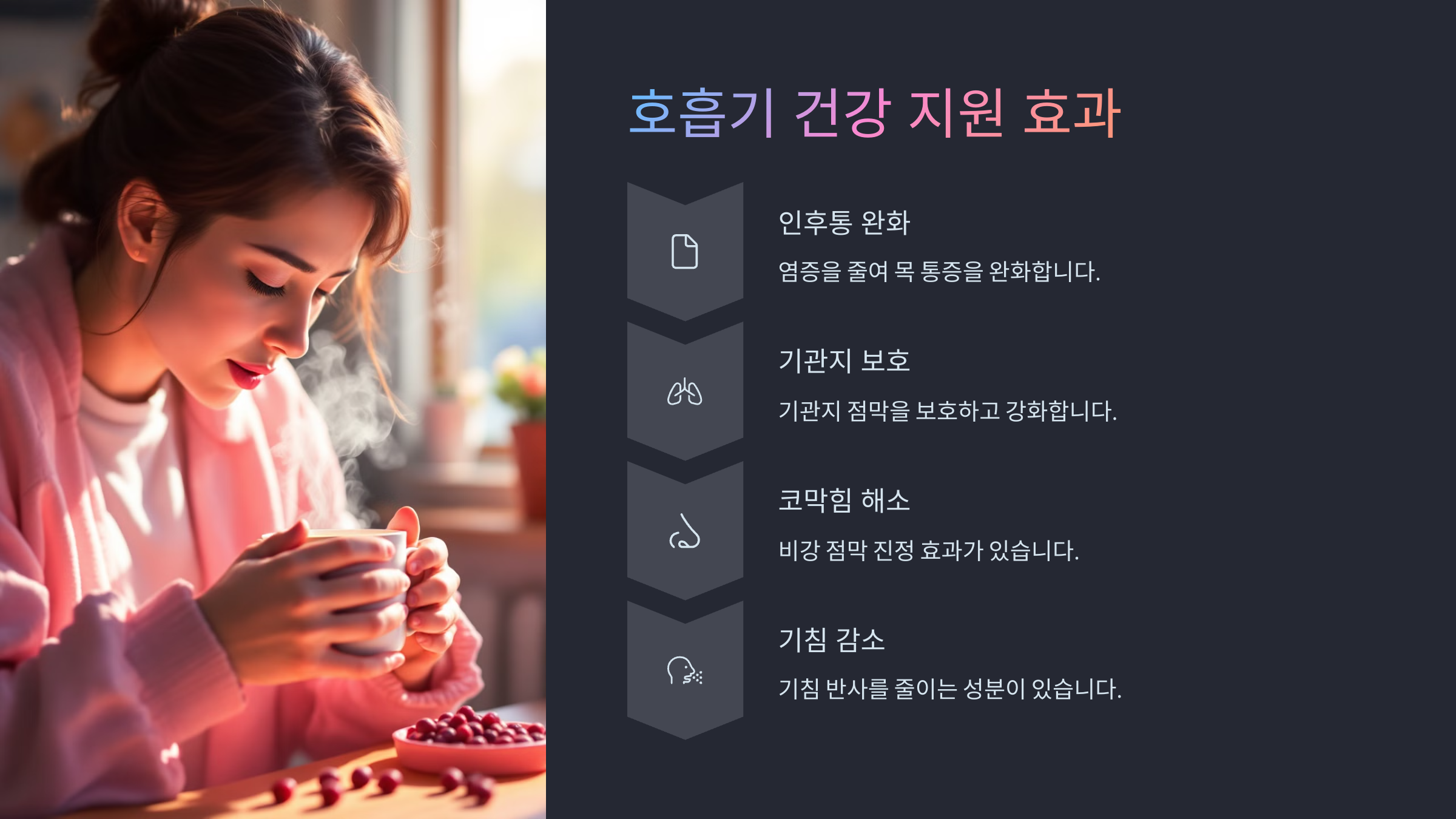 이제 다음으로 대추차가 호흡기 증상, 특히 코막힘이나 기침에 어떤 영향을 미치는지 알아볼게요. 정말 많은 분들이 궁금해하시거든요 😷