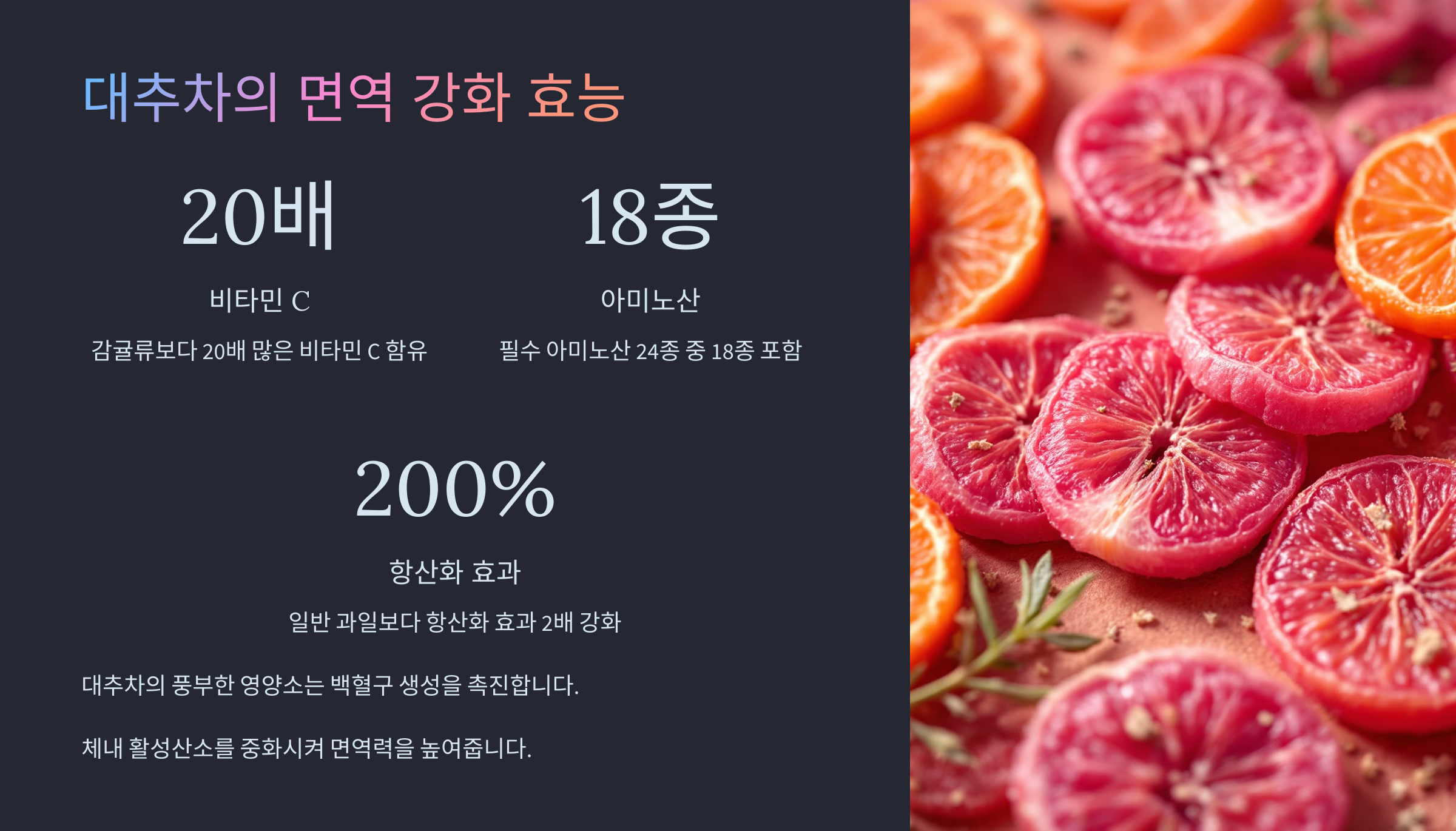 가장 큰 장점은 비타민 C 함량이에요. 비타민 C는 면역력 강화에 핵심적인 영양소인데, 대추에는 사과보다도 많은 비타민 C가 들어있어요. 이 성분이 감기 바이러스의 활동을 억제하고 몸의 방어력을 높여줘요.