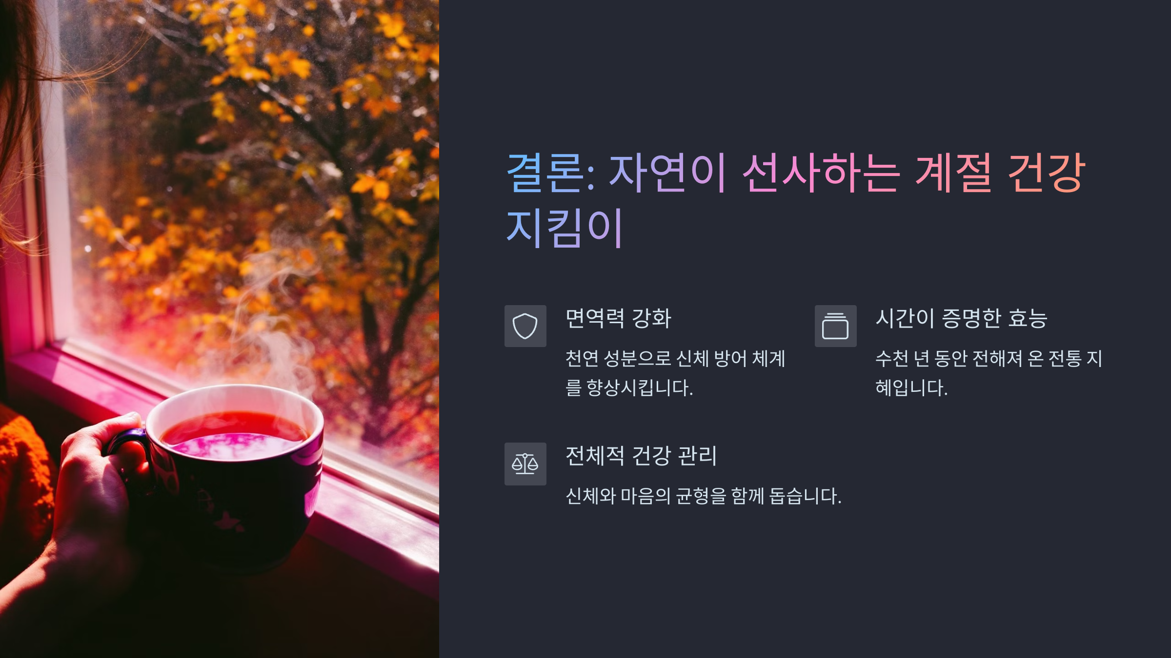 제가 생각했을 때 가장 중요한 건 꾸준한 체온 유지예요. 따뜻하게 몸을 보호해주는 것만으로도 면역력은 꽤 많이 유지할 수 있거든요. 그러니까 얇은 옷을 겹겹이 입거나 따뜻한 음식, 특히 대추차 같은 음료로 몸을 보온하는 게 정말 중요해요.