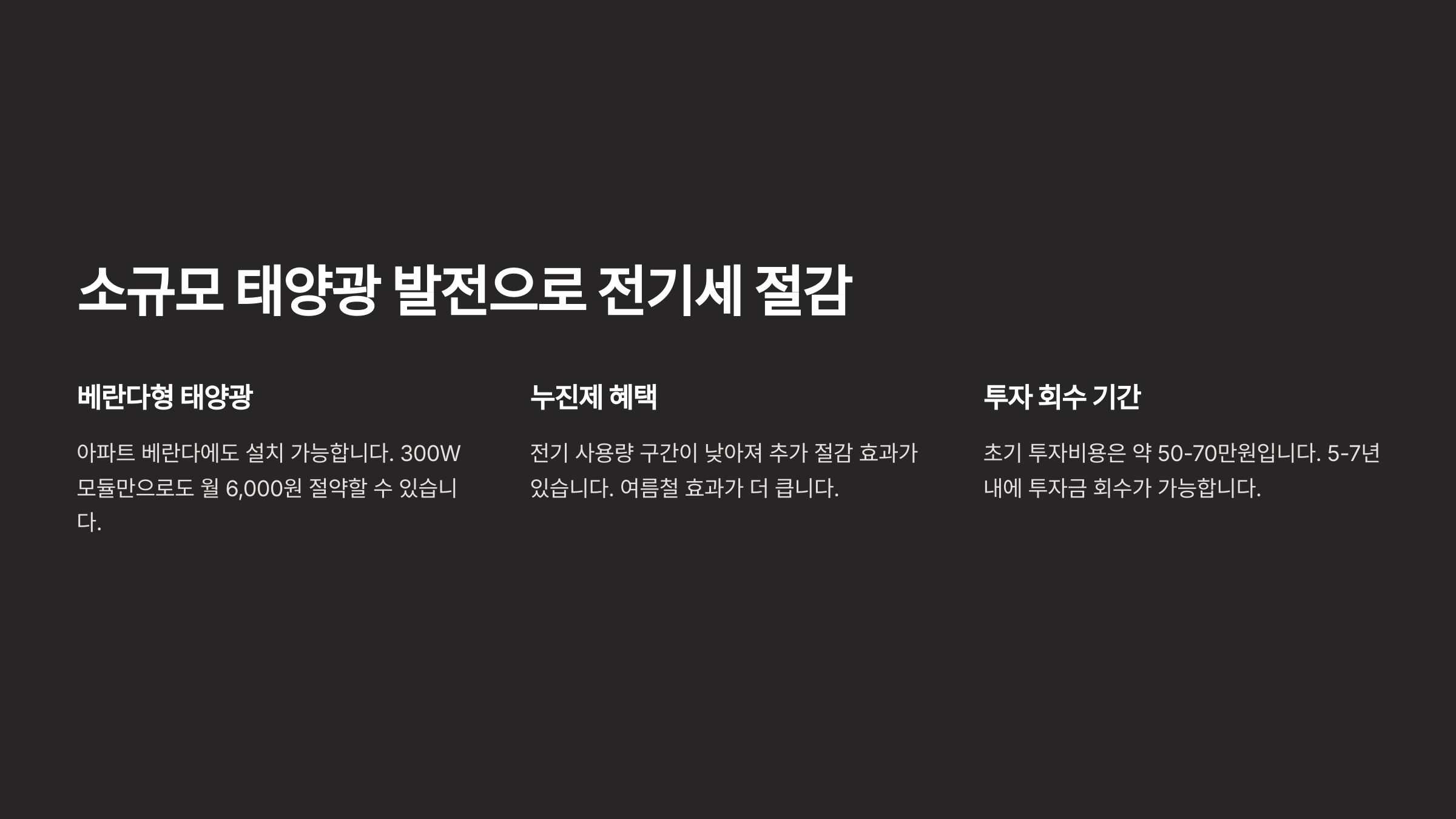 👉 다음 섹션에서는 소규모 태양광 발전으로 전기세를 절감하는 방법을 알아볼까요? 🔆