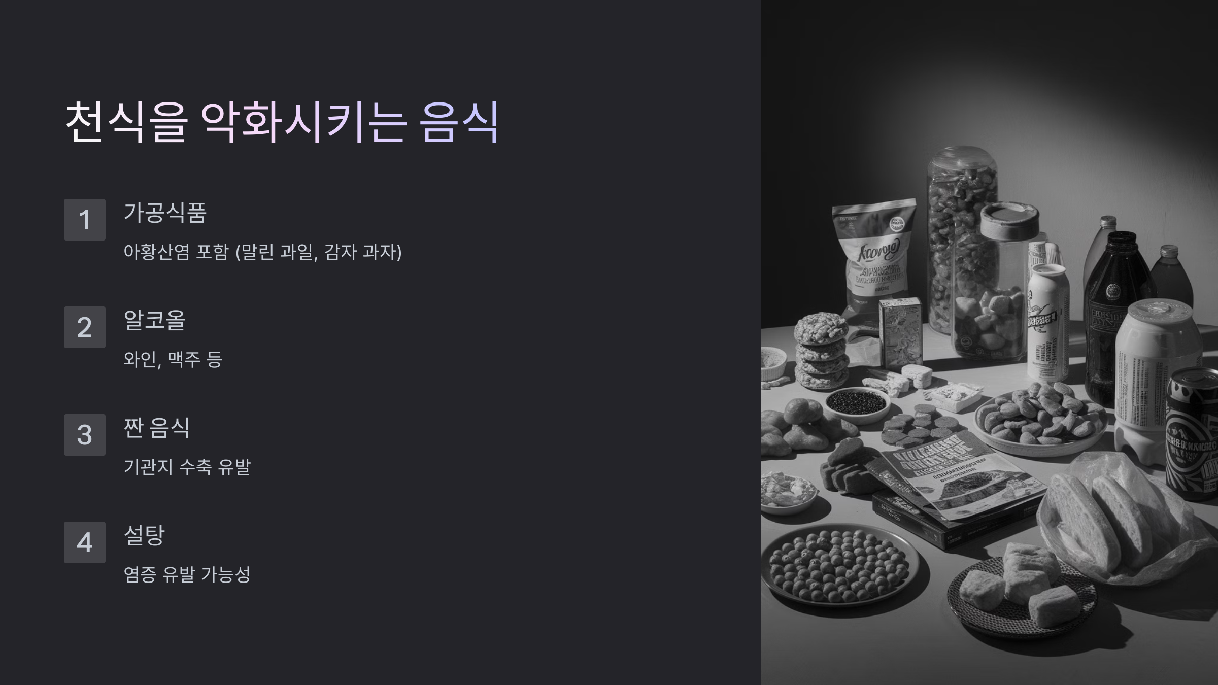 천식 증상을 더 악화시키는 음식들도 있어요. 특히 기도 염증을 유발하거나 알레르기 반응을 촉진하는 음식들은 피하는 게 좋아요.
