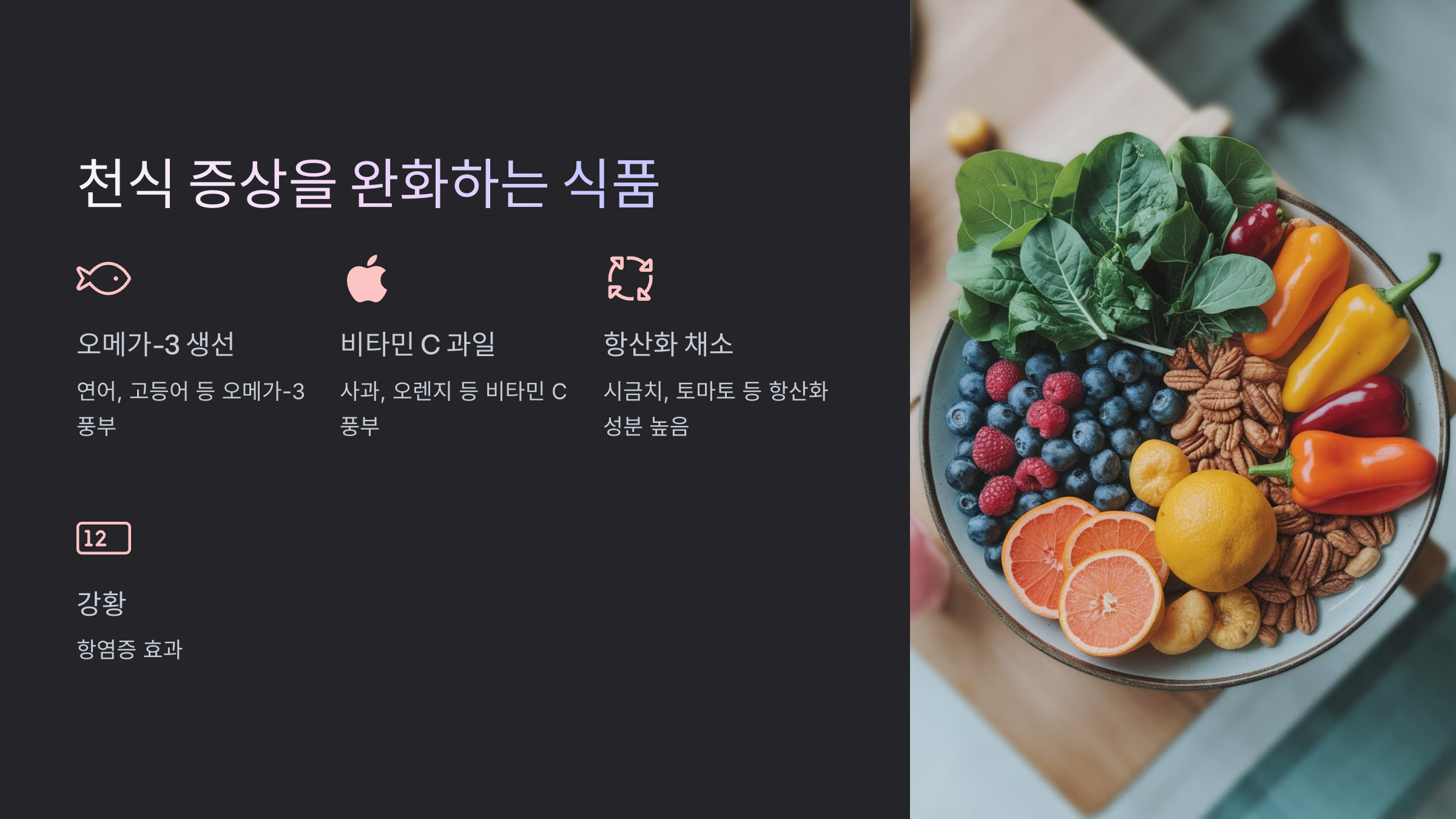 천식 완화에 도움을 주는 음식들은 대부분 항산화 성분이 풍부하고, 항염 효과가 있는 식품들이에요. 이런 음식들은 기도의 염증을 줄이고 호흡을 더 편안하게 만들어줘요.