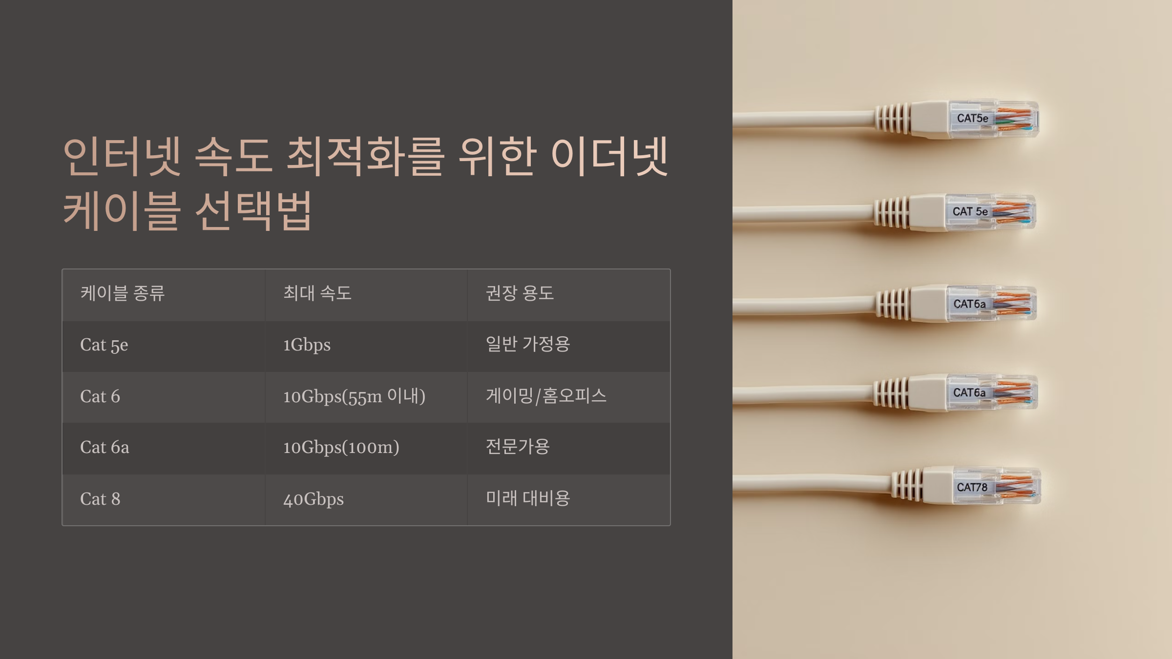 만약 초고속 인터넷(1Gbps 이상)을 사용하고 있다면 Cat6a나 Cat7을 추천해요. 게임이나 고해상도 영상 편집처럼 대용량 데이터를 주고받는다면 Cat8까지 고려할 수도 있어요.