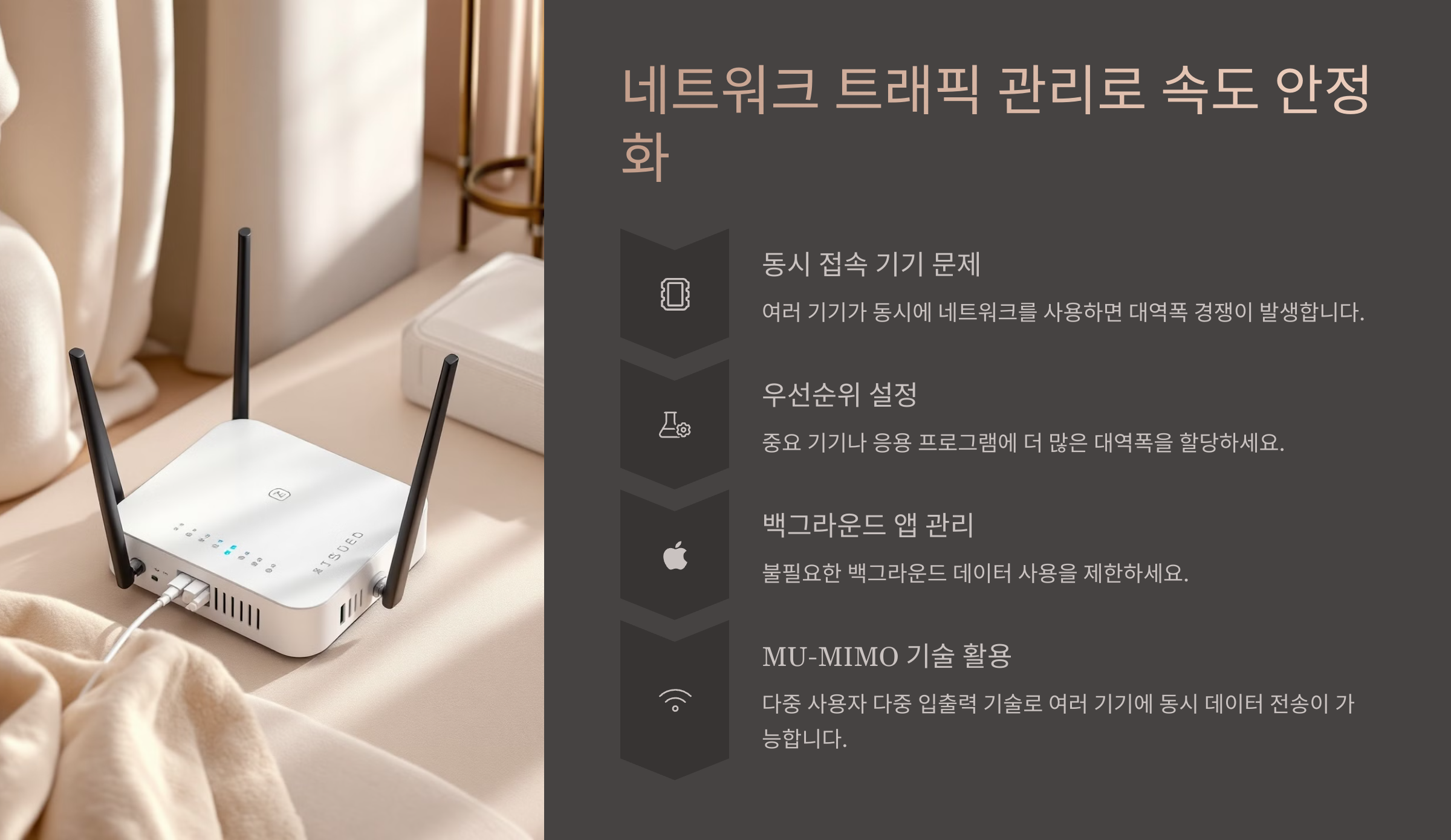 스마트홈 시대가 되면서 인터넷에 연결된 기기가 점점 늘어나고 있어요. 스마트 TV, CCTV, AI 스피커, 로봇 청소기까지 다양한 기기가 Wi-Fi를 사용하죠. 하지만 너무 많은 기기가 네트워크를 사용하면 인터넷 속도가 느려질 수 있어요.