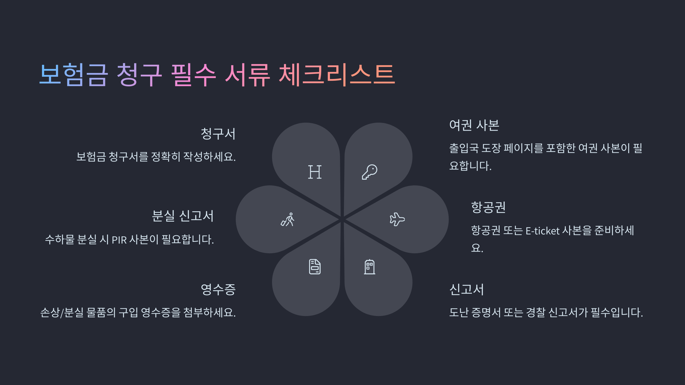 특히, **소지품 도난·분실 보상 청구** 시에는 경찰 신고서나 항공사에서 발급한 서류가 필수예요. 단순히 "분실한 것 같다"라고만 하면 보험금을 받을 수 없어요. 📃
