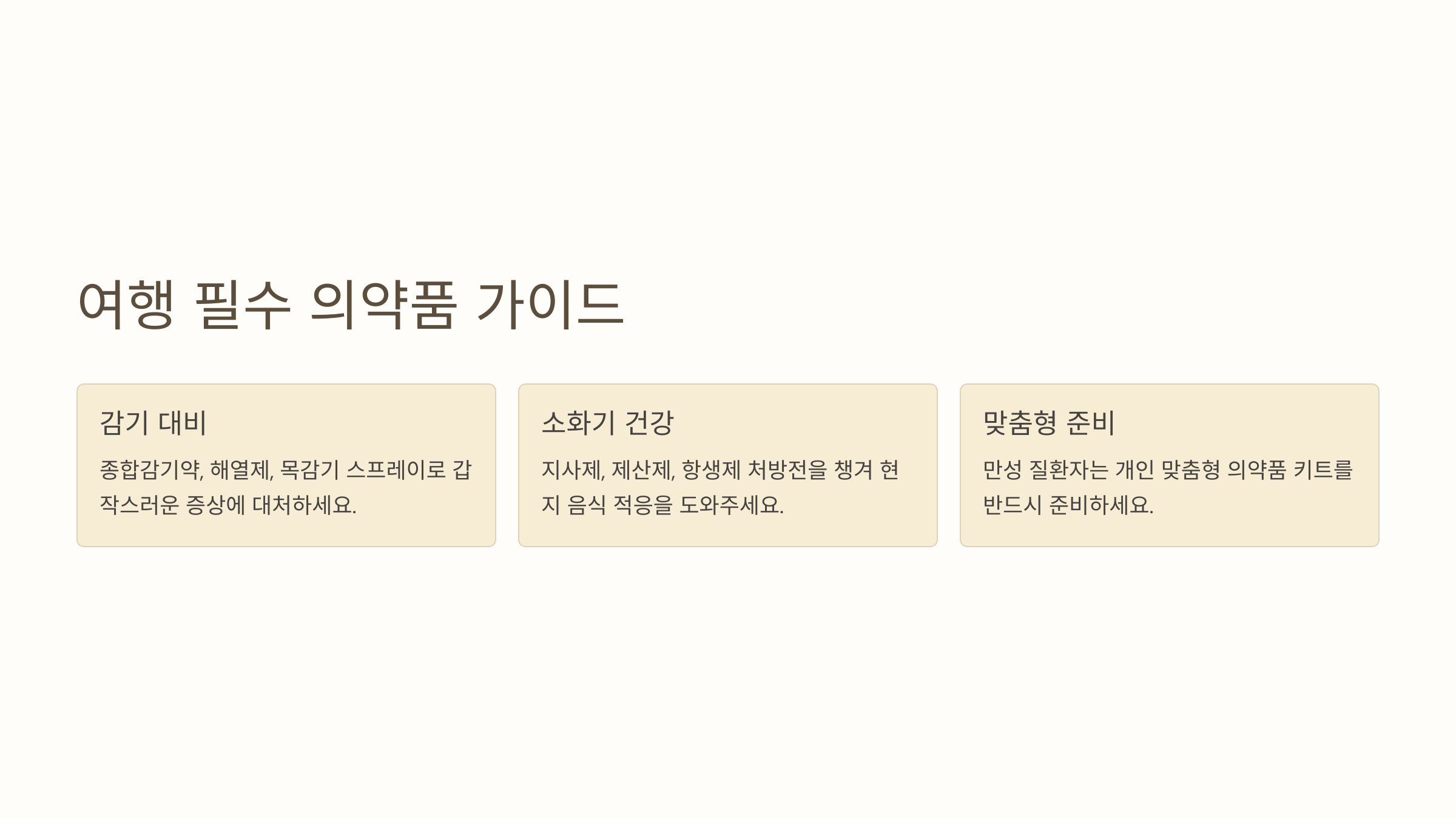 💡 TIP: 해외에서는 우리나라처럼 약을 쉽게 구매하기 어려울 수 있어요. 기본적인 의약품은 꼭 미리 준비하세요!