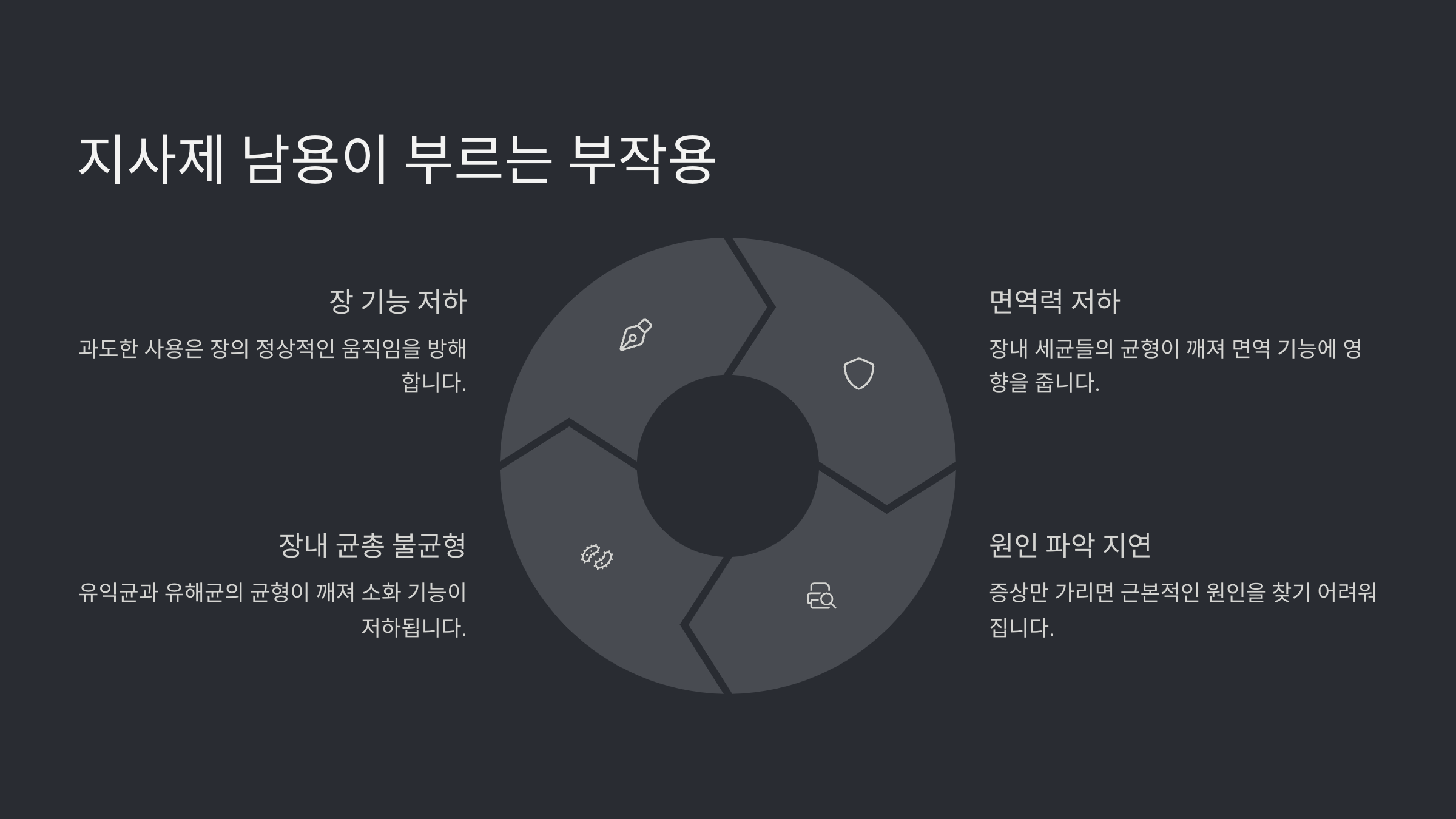 | 장내 균형 파괴 | 유익균과 유해균의 균형이 깨지면서 장 건강 악화 |