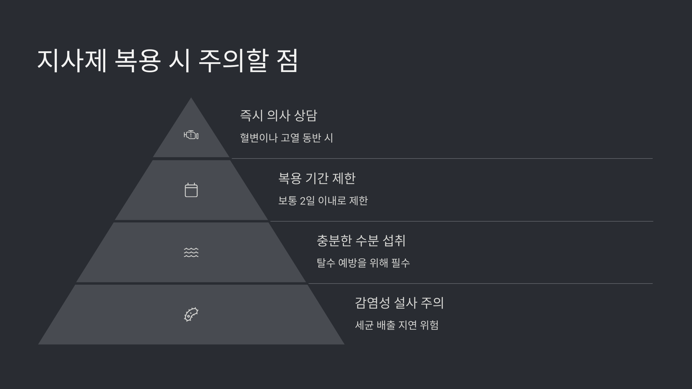 지사제는 일시적인 해결책일 뿐, 근본적인 치료제는 아니에요. 만약 설사가 3일 이상 지속되거나, 발열, 혈변 등의 증상이 동반된다면 반드시 병원을 찾아야 해요. 🚑