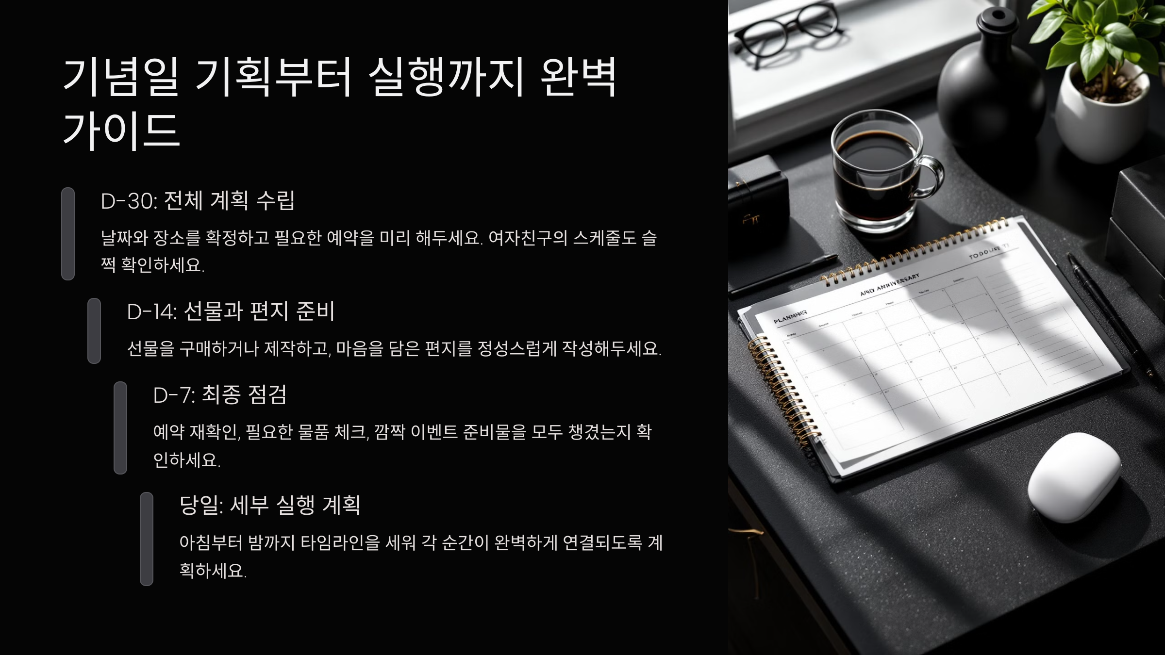 기념일 준비는 장소, 이벤트, 선물, 분위기까지 신경 써야 할 게 많아요. 하지만 어렵지 않아요! 단계별로 차근차근 준비하면 되거든요.