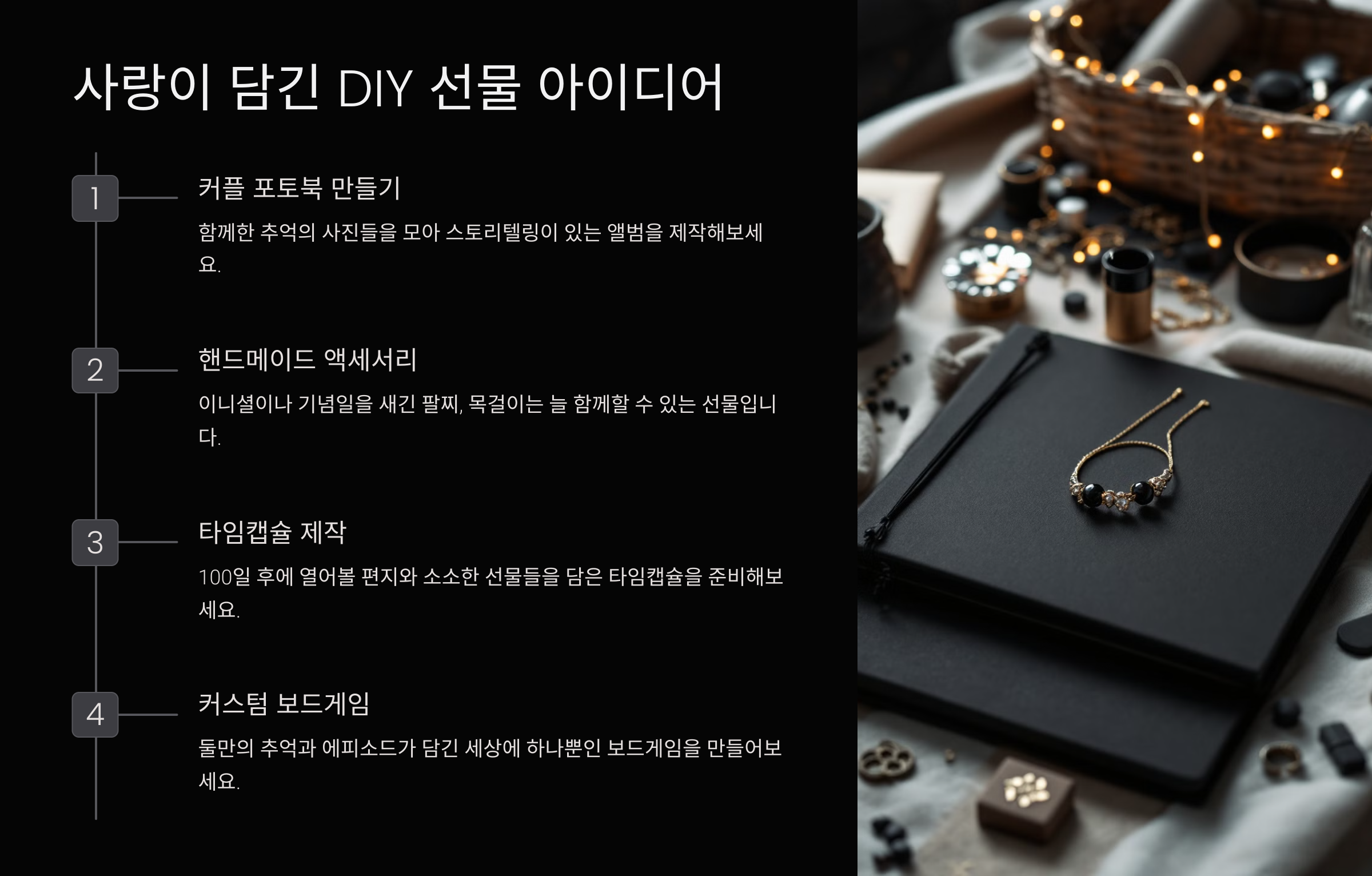 예를 들어, 두 사람의 추억이 담긴 포토북을 만들거나, 직접 향수를 조향해서 선물하는 것도 감동적인 방법이에요. ✨