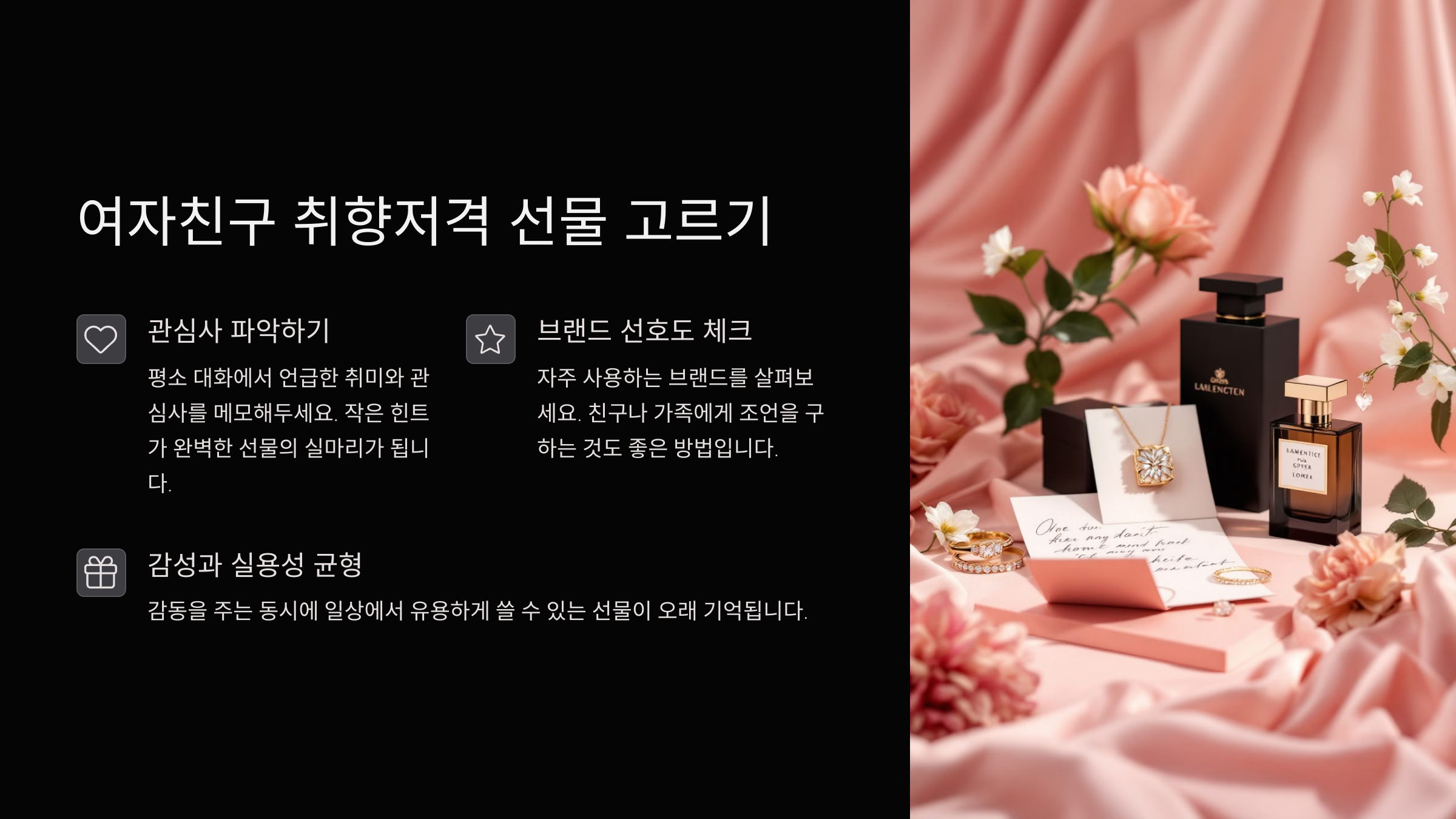 여자친구가 평소에 관심 있어 하는 브랜드나 좋아하는 색깔을 기억해두세요. 예를 들어, 그녀가 향수를 좋아한다면 플로럴 계열인지 시트러스 계열인지 먼저 파악하는 게 중요하죠.