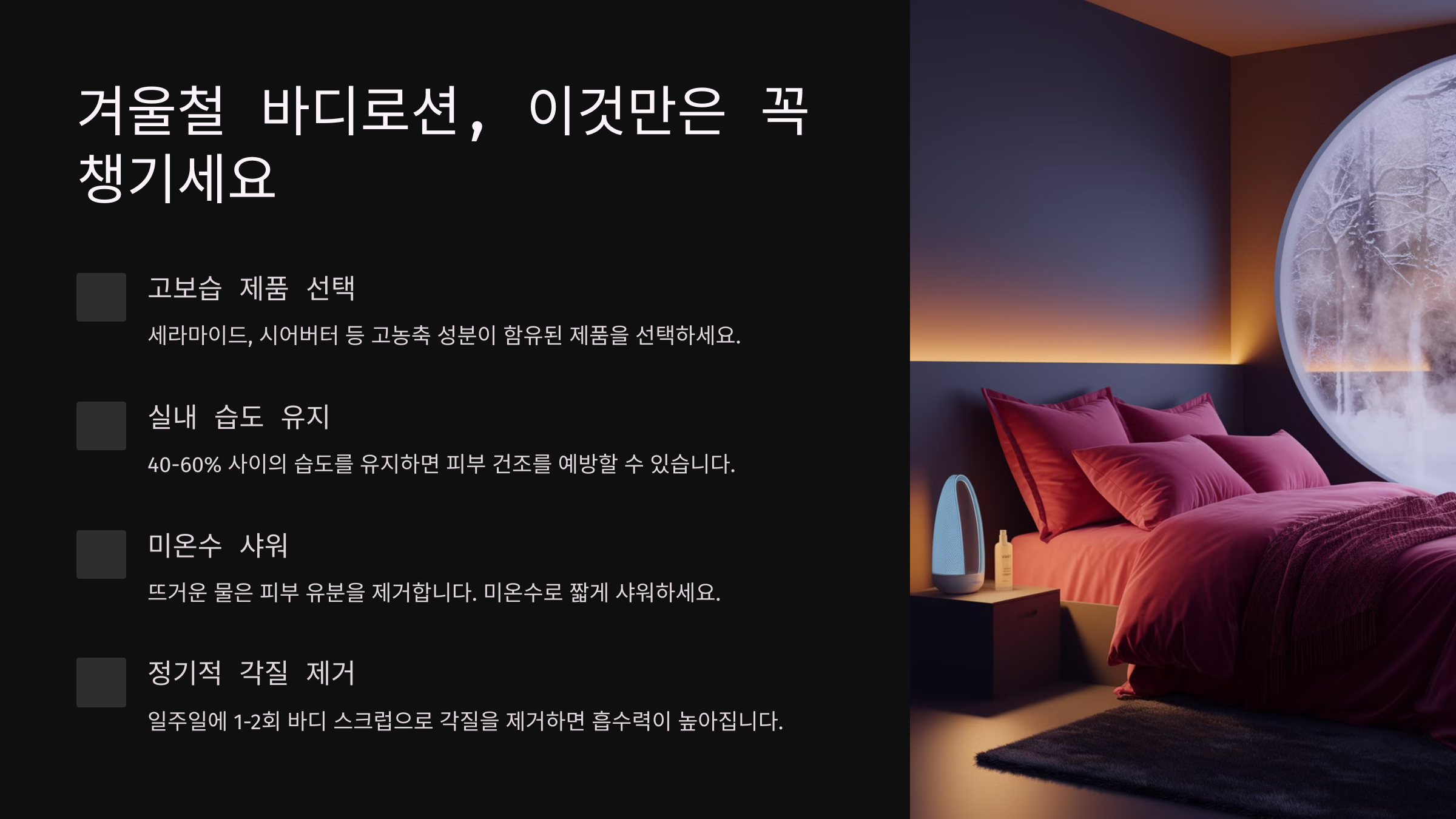 이 방법들을 활용하면 바디로션의 효과를 더욱 극대화할 수 있어요! 다음 섹션에서는 겨울철 필수 보습 루틴을 알려드릴게요. ❄️