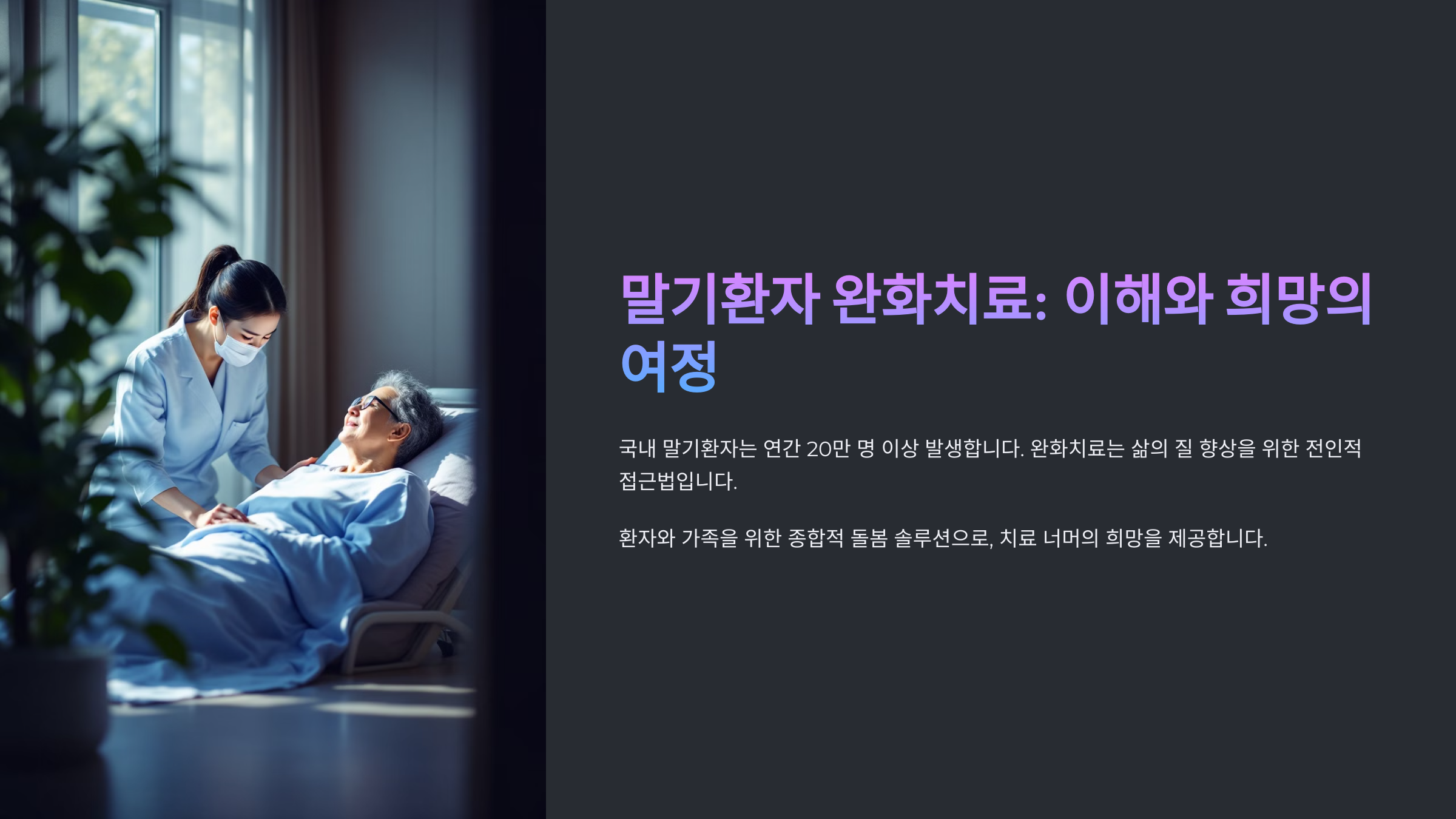 완화치료(palliative care)는 말기환자의 삶의 질을 향상시키기 위해 신체적, 정서적, 사회적, 영적인 측면을 종합적으로 돌보는 의료 서비스예요. 단순한 치료가 아니라, 환자가 편안한 삶을 유지할 수 있도록 도와주는 것이 핵심이죠.