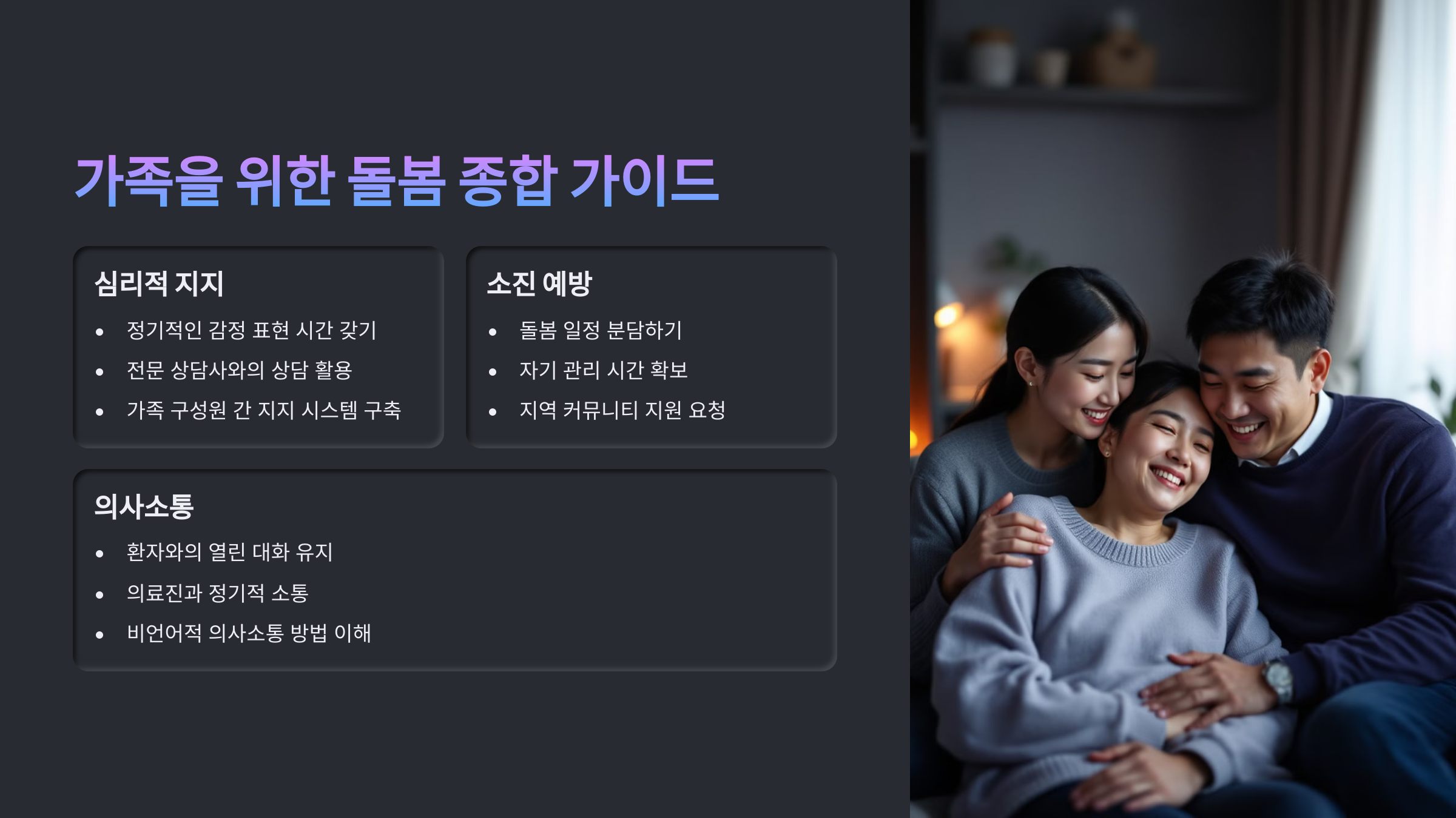 환자를 돌보는 가족들도 신체적, 정신적으로 큰 부담을 느낄 수 있어요. 가족이 건강해야 환자도 더 나은 환경에서 치료받을 수 있죠. 그렇다면 가족들이 어떤 점을 유의해야 할까요?