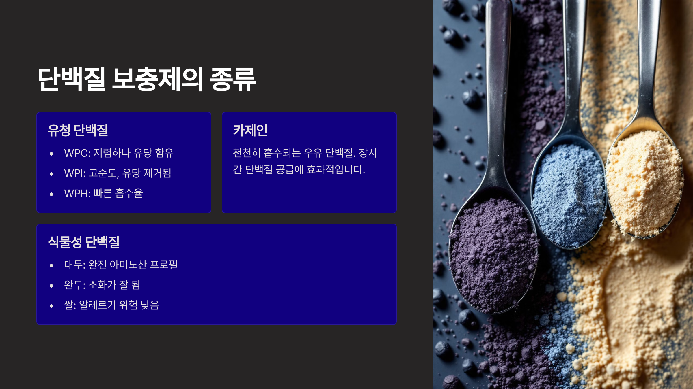 | 유청 단백질 | 빠름 | 운동 후 빠른 회복 |