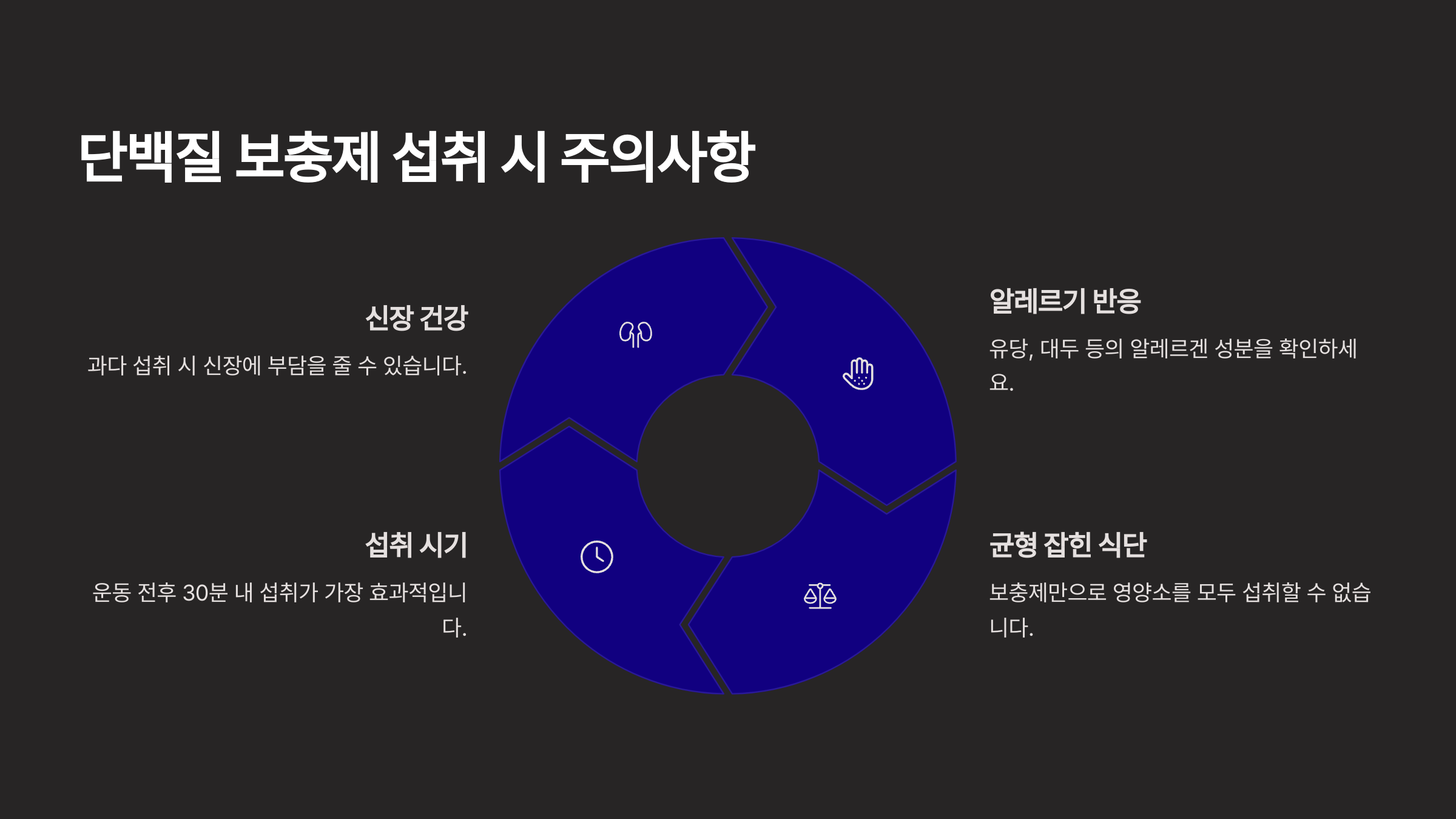 | 과다 섭취 금지 | 필요 이상 단백질은 지방으로 전환될 수 있음 |