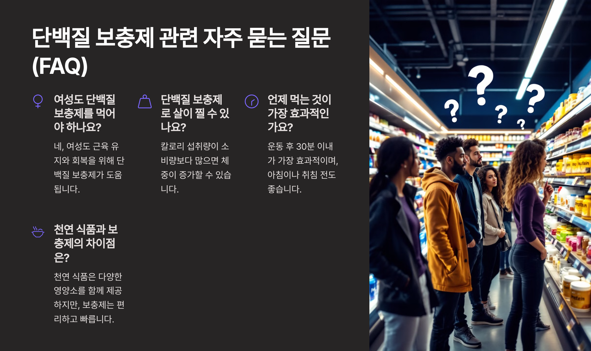 👇 마지막으로, 단백질 보충제에 대한 자주 묻는 질문(FAQ)을 확인해볼까요? 👇