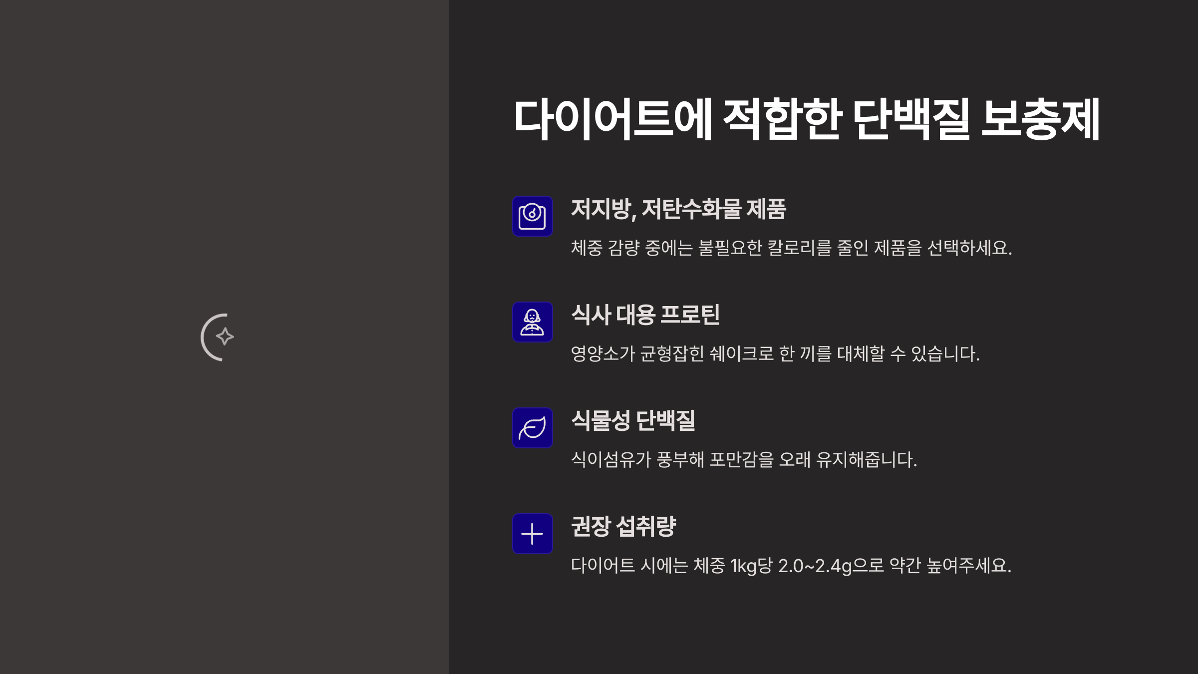 | 식물성 단백질 | 낮음 | 소화가 잘되고 포만감 유지 |