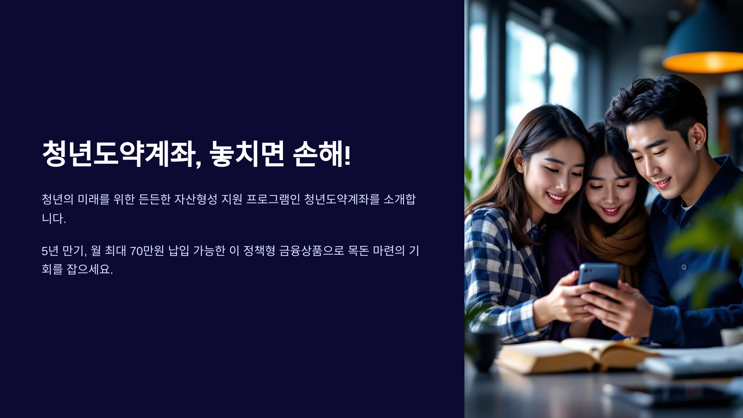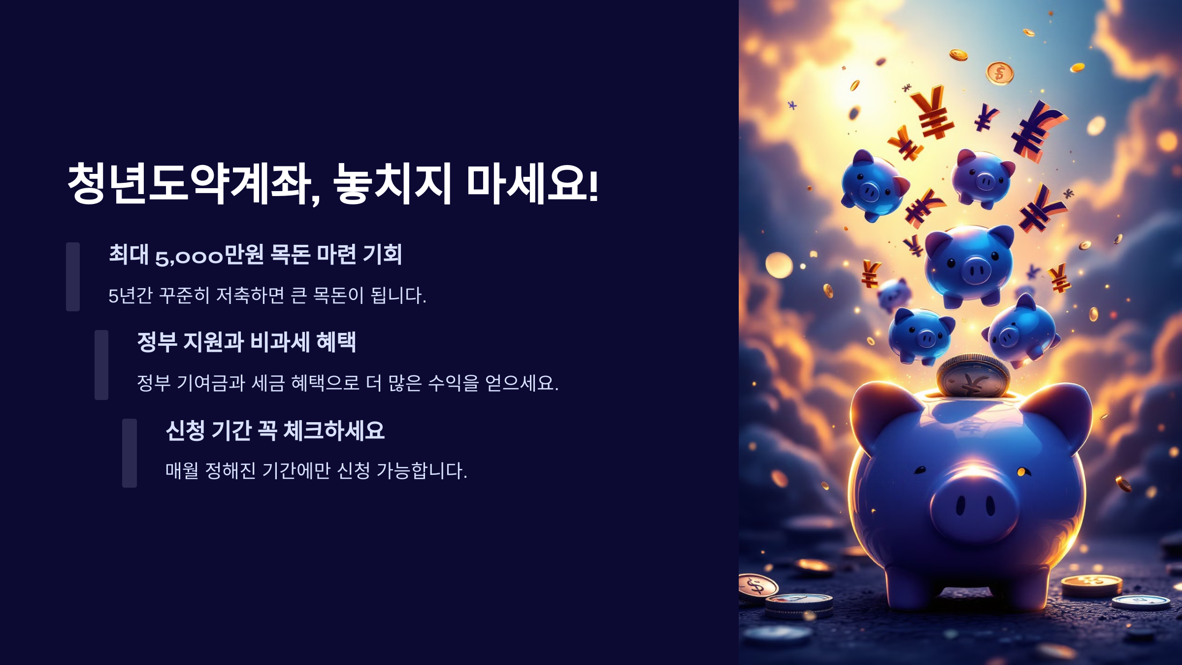 💰 청년도약계좌는 정부가 청년들의 자산 형성을 돕기 위해 출시한 장기저축상품이에요. 5년간 꾸준히 저축하면 정부 지원금과 이자가 함께 쌓여 목돈을 마련할 수 있답니다.