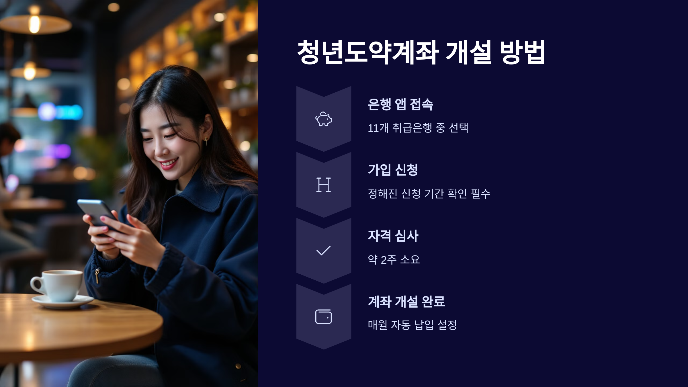 청년도약계좌는 온라인 또는 은행 방문을 통해 개설할 수 있어요. 요즘은 대부분의 은행이 모바일 앱을 통해 가입을 지원하기 때문에 스마트폰만 있으면 간편하게 개설할 수 있답니다.