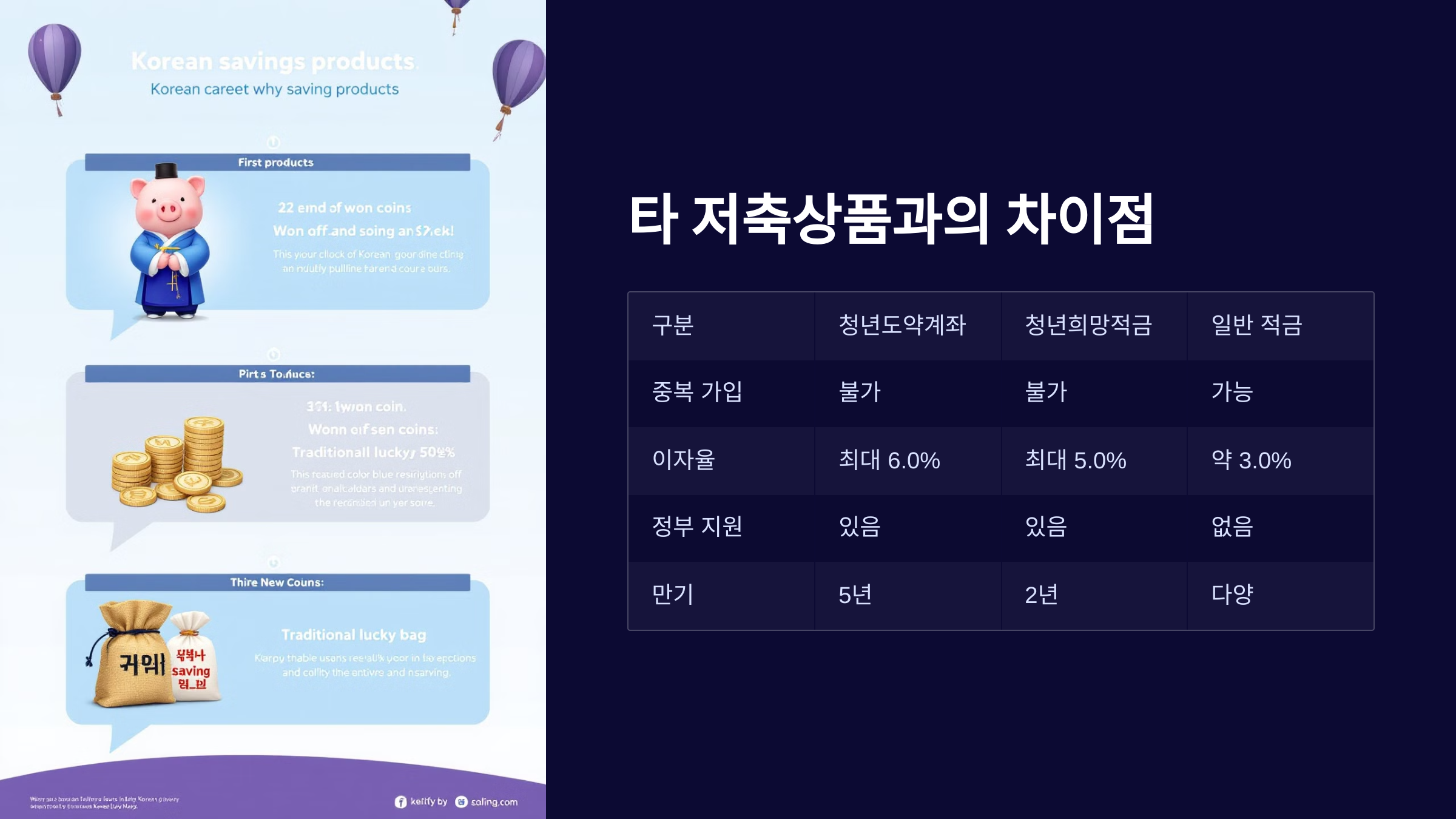 반면 일반 적금은 단순한 저축상품이라서 본인이 납입한 금액과 이자만 받을 수 있어요. 청년희망적금은 높은 이율이 장점이지만, 가입 대상과 지원 조건이 다르답니다.