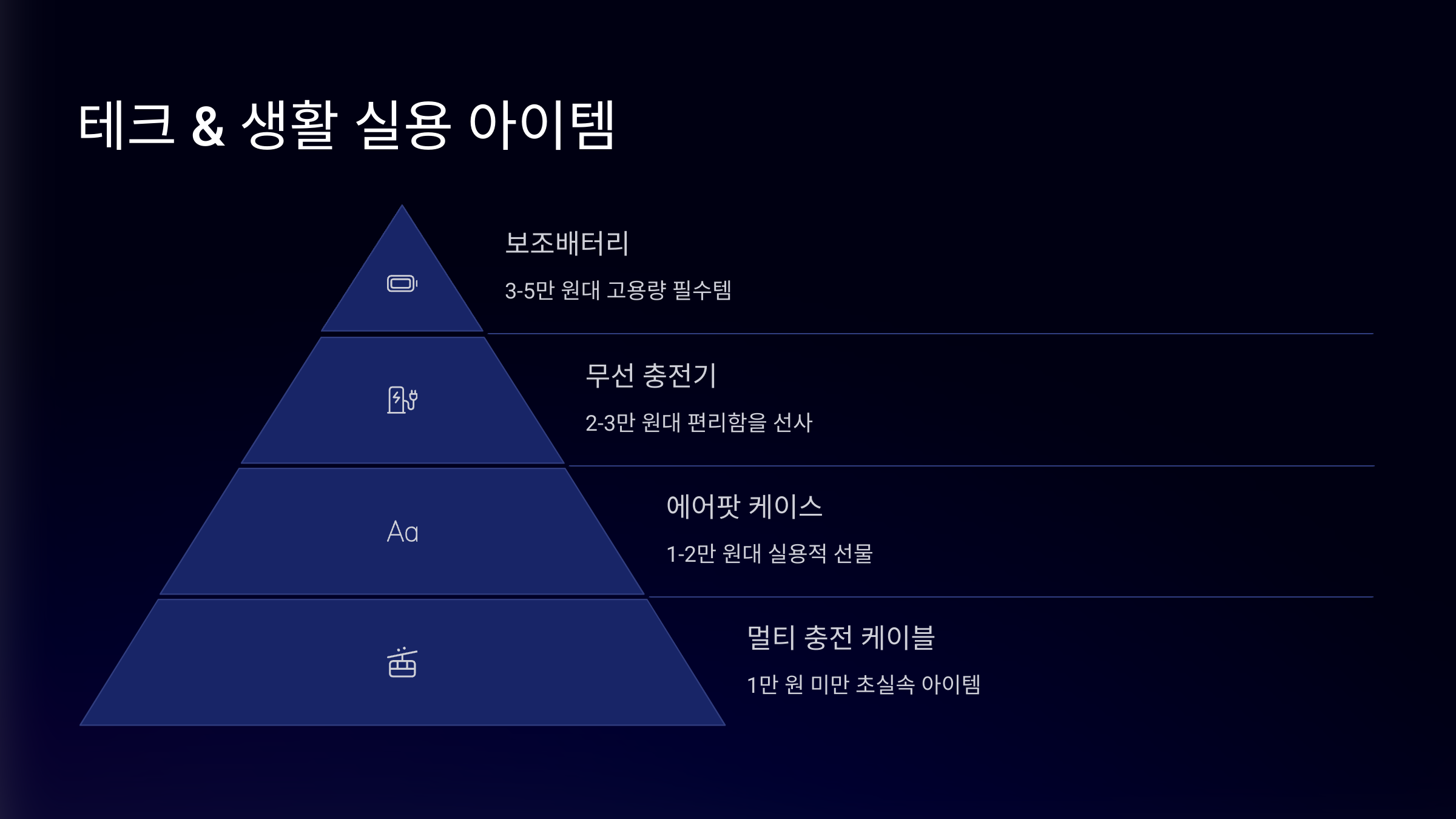 | 무선 충전 거치대 | 3만 원~5만 원 | 스마트폰 사용자 필수템 |